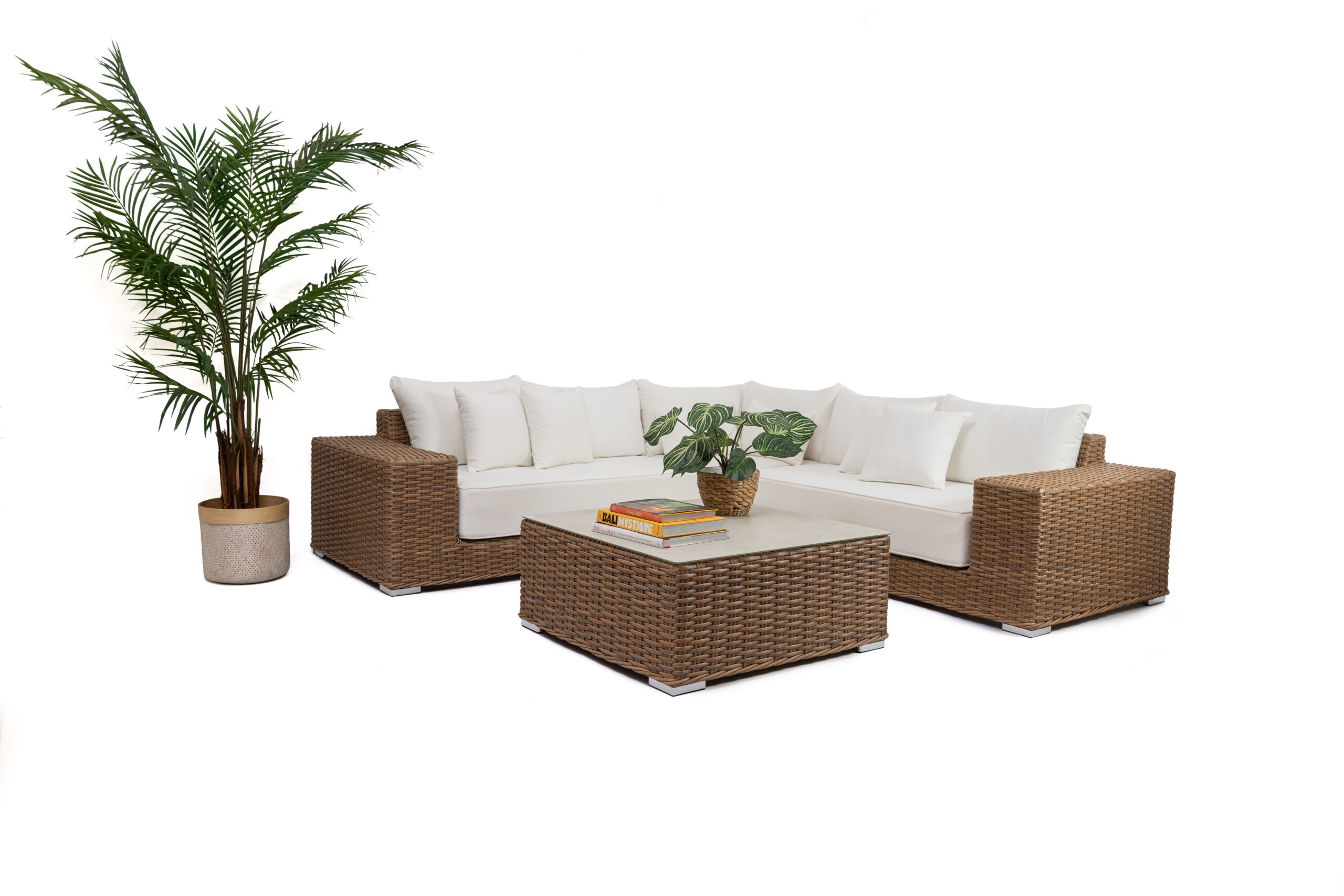 Estructura en aluminio, tejido en rattan sintético. Incluye cojinería.