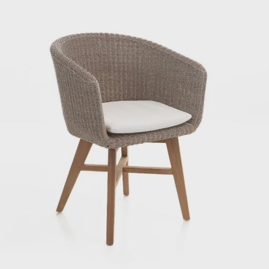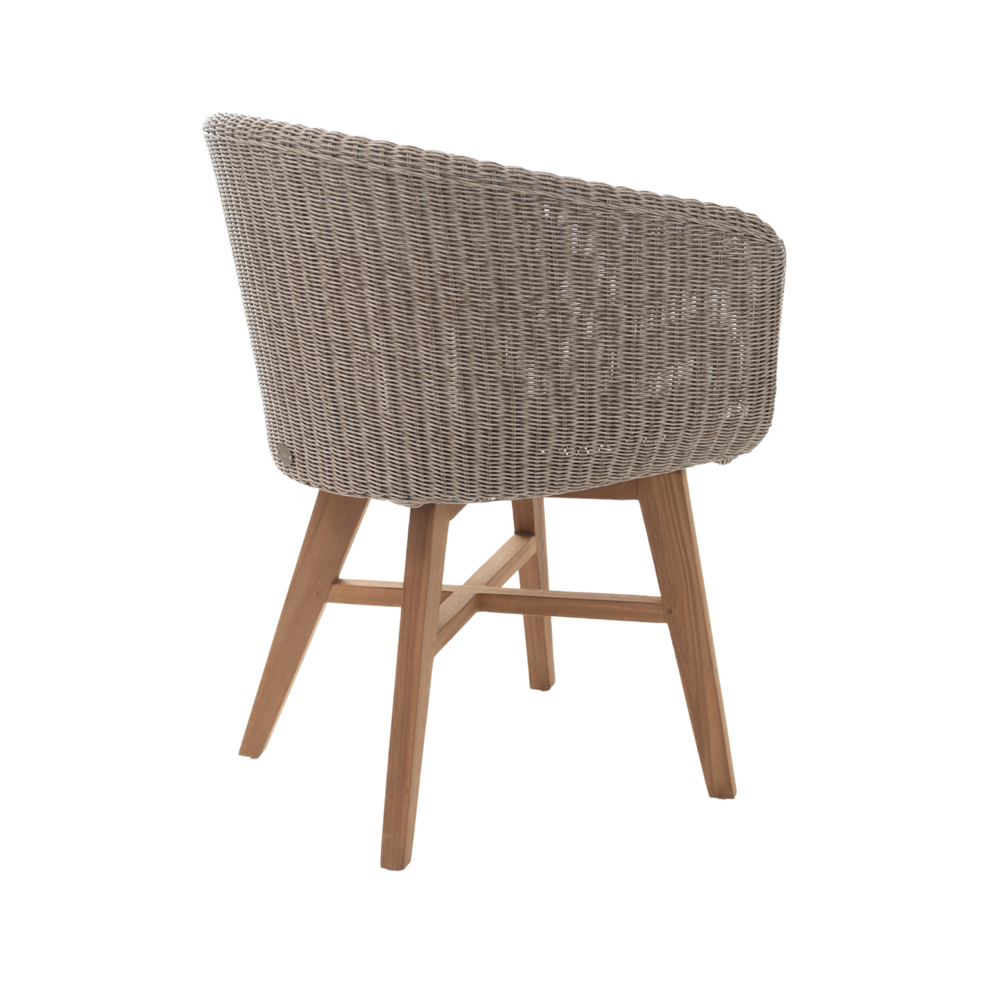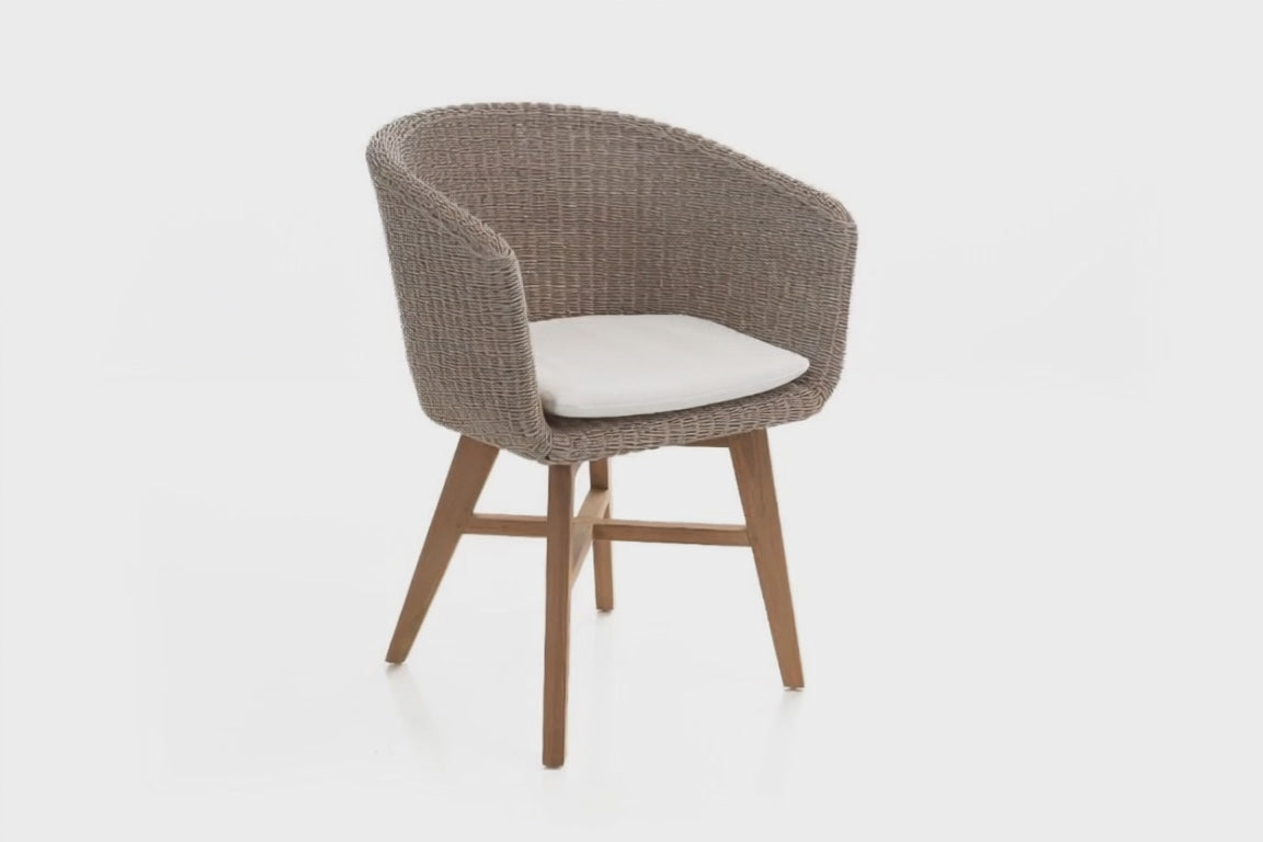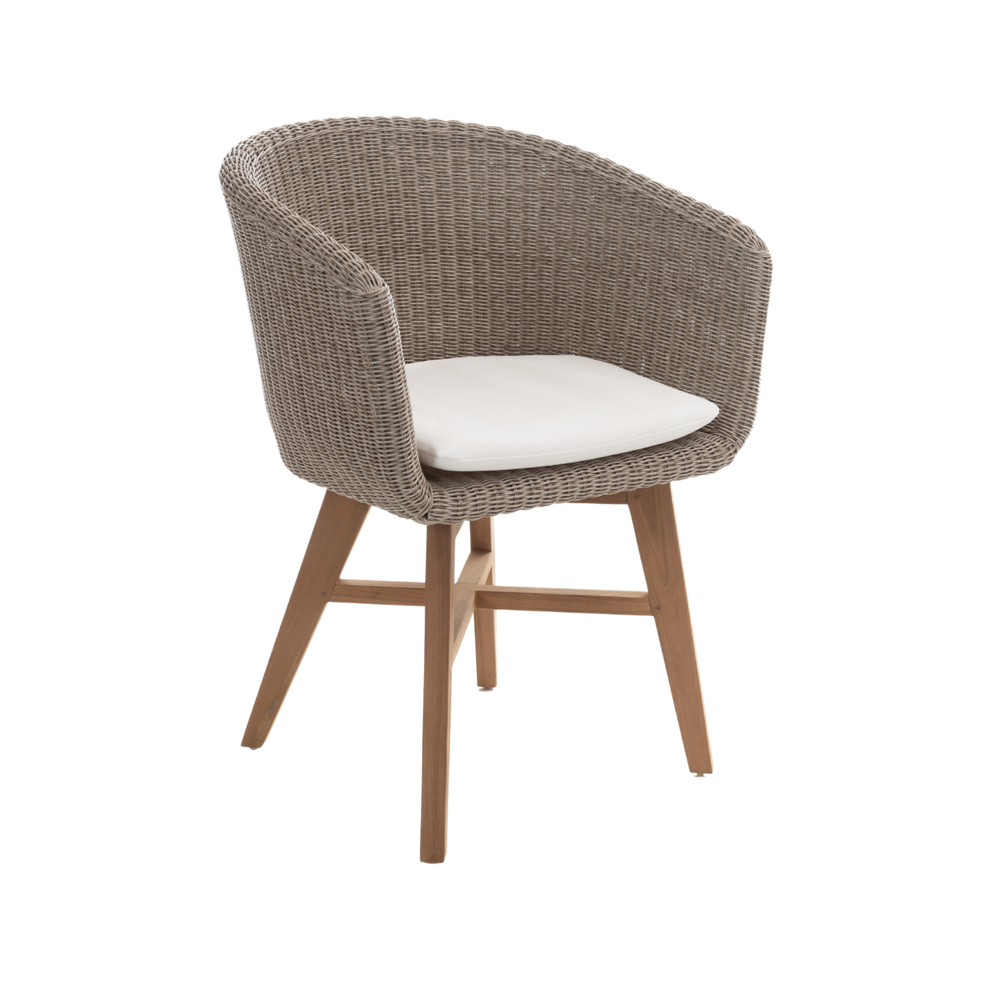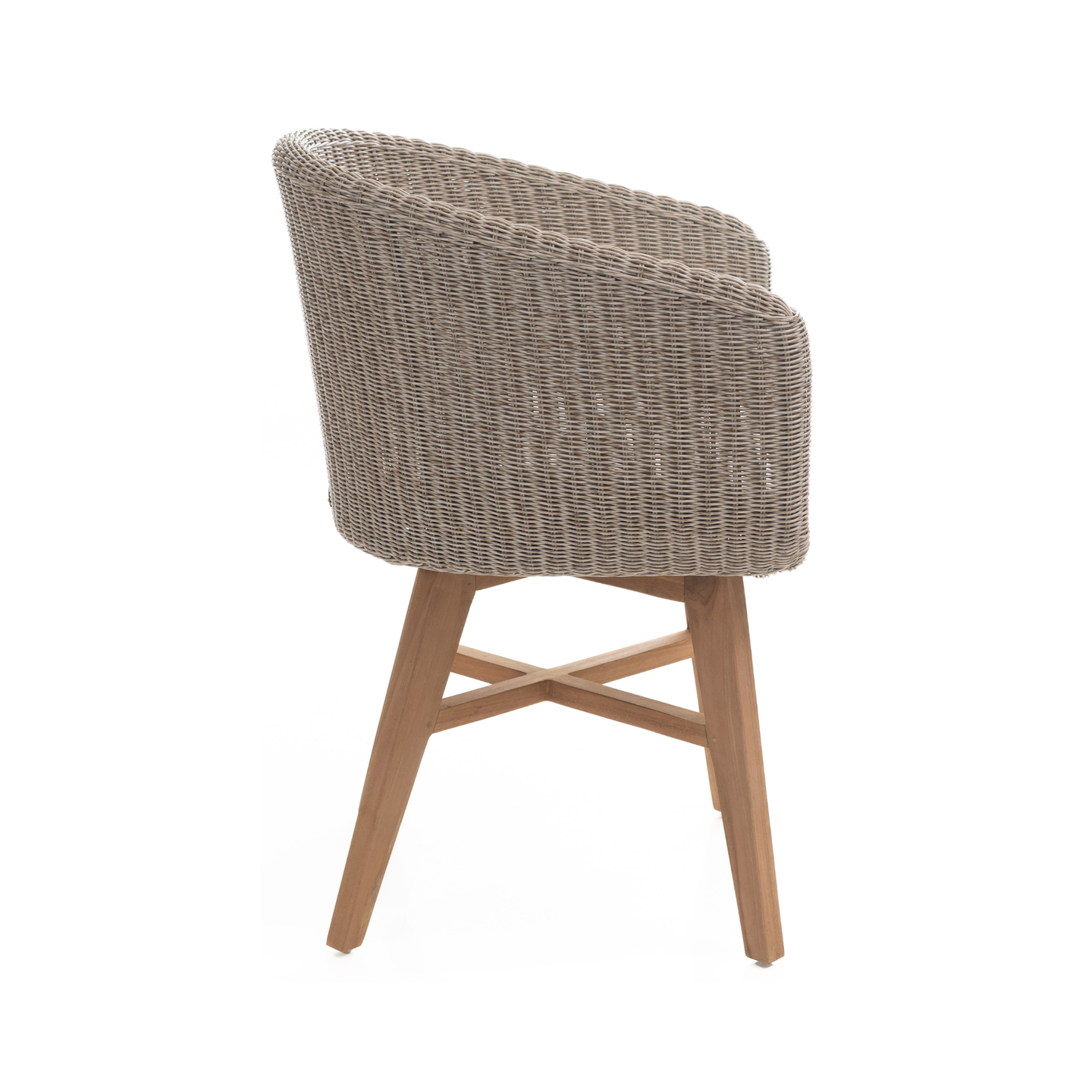 Silla comedor con brazos mw-w intemp abbey. Estructura en aluminio, tejido en rattan sintético. Patas en madera teca. Cojínería elaborada en tela para uso exterior.