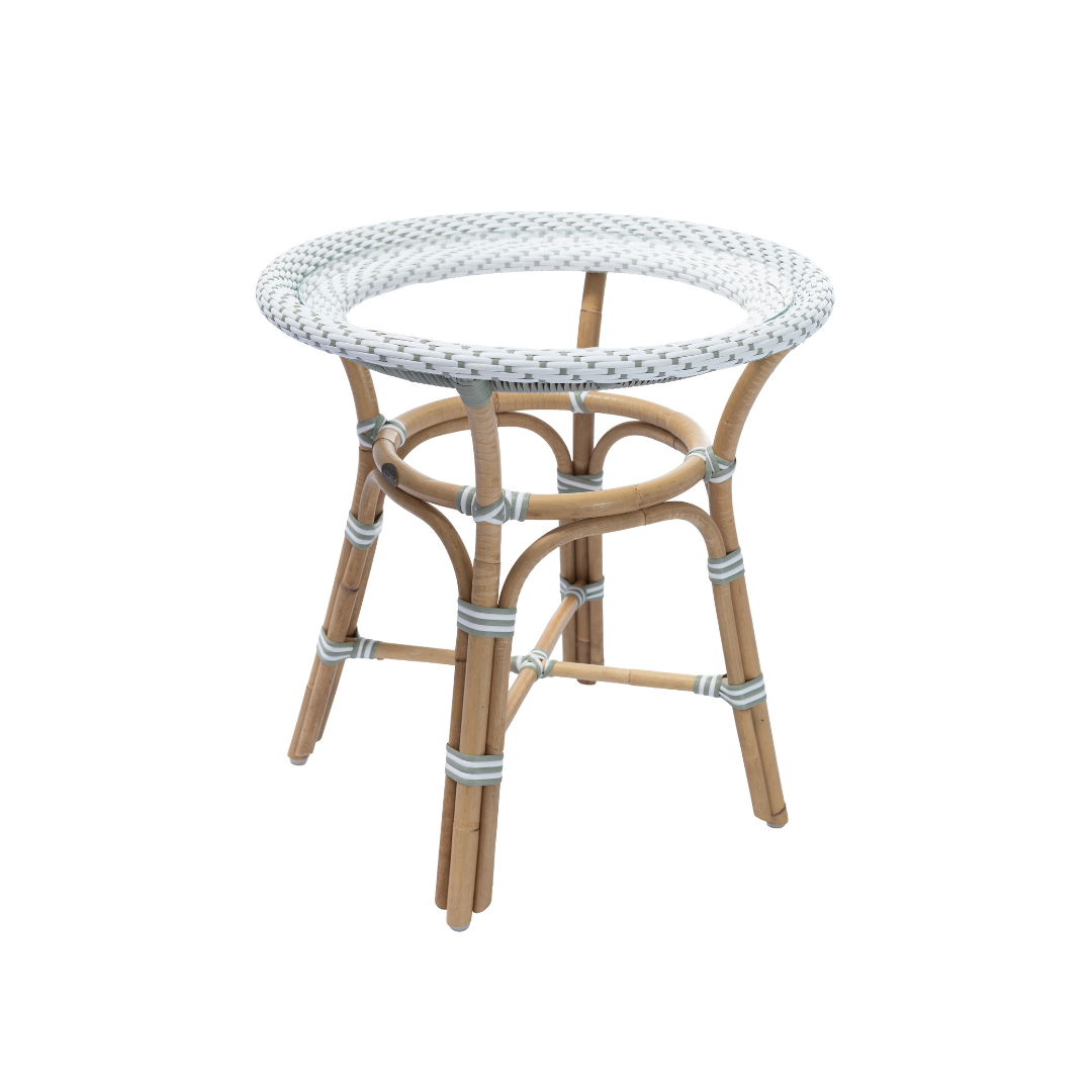 Mesa auxiliar con vidrio diam 60 Afrodita bistró color bistró color sage blanco. Estructura en vara de ratán con corteza y tejido en rattan sintético.Incluye vidrio