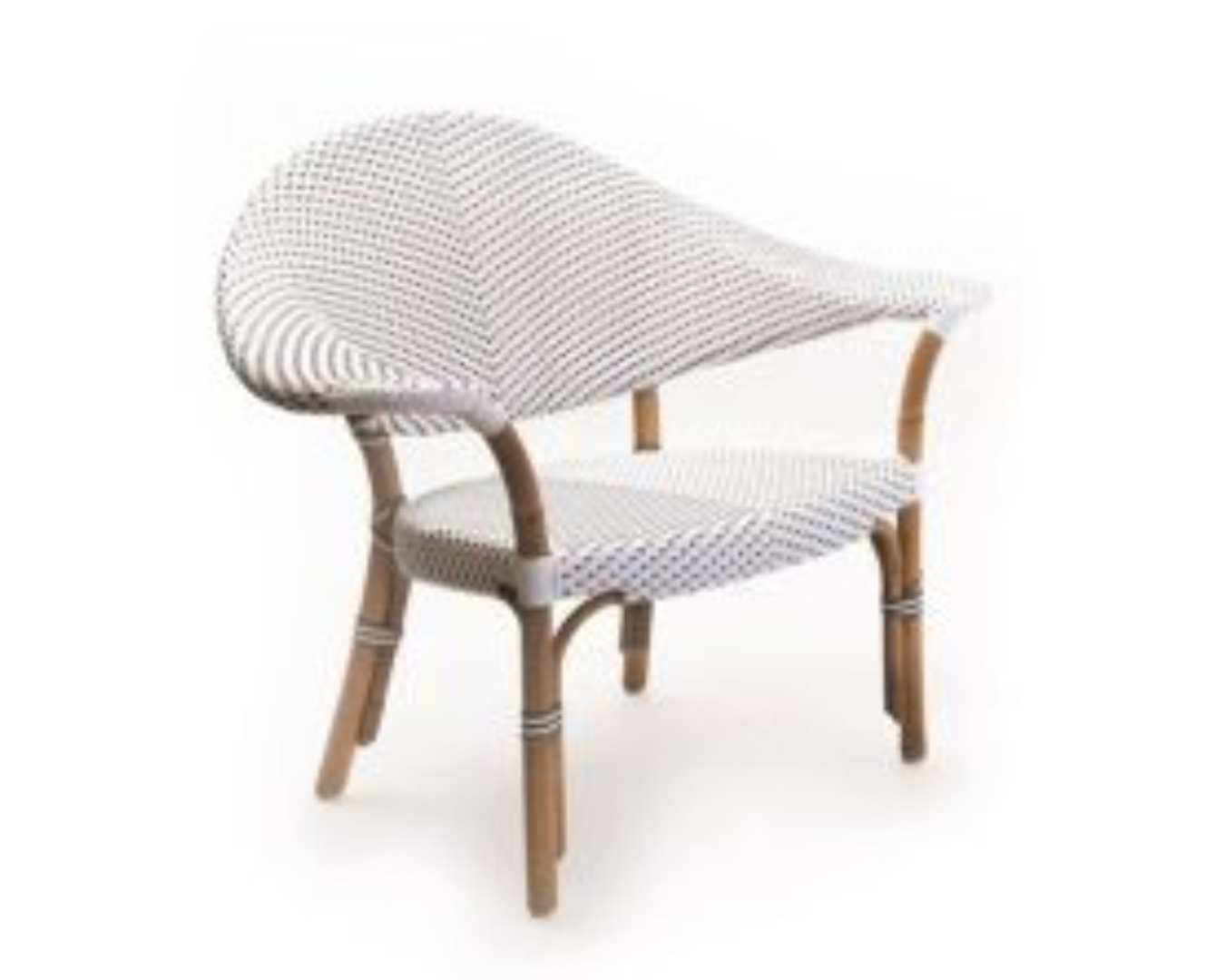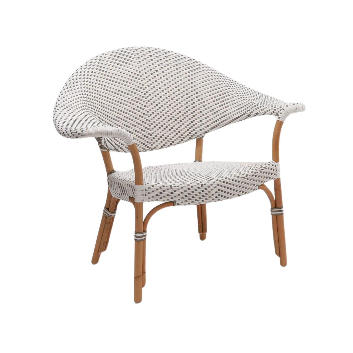 Poltrona white-stn afrodita Bistro. Estructura en vara de rattan con corteza, tejido en rattan sintético.