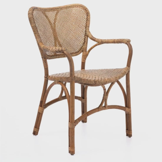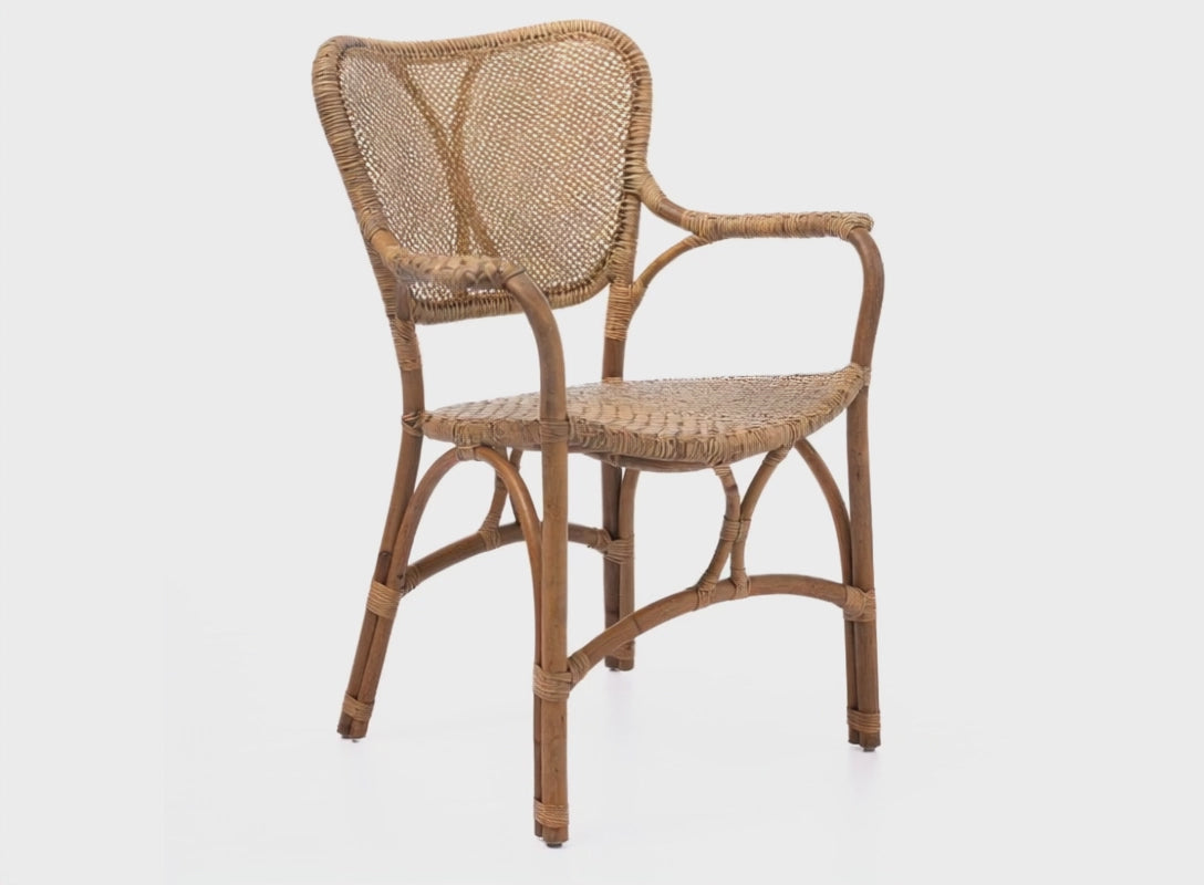 Silla comedor con brazos anticado alysa. Estructura en vara de rattan sin corteza. Sentadero y espaldar tejidos en cáscara de rattan.