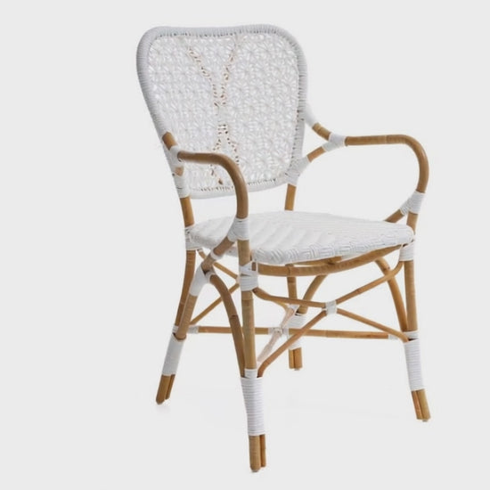 Silla comedor con brazos blanca amara. Estructura en vara de rattan con corteza, tejido en rattan sintético. .