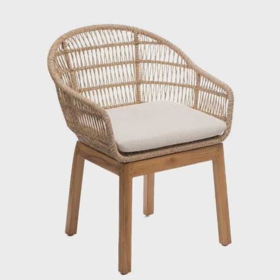 Silla comedor intemp amora II. Estructura en aluminio, tejido en lazo sintético. Patas en madera teca. Cojínería elaborada en tela para uso exterior.