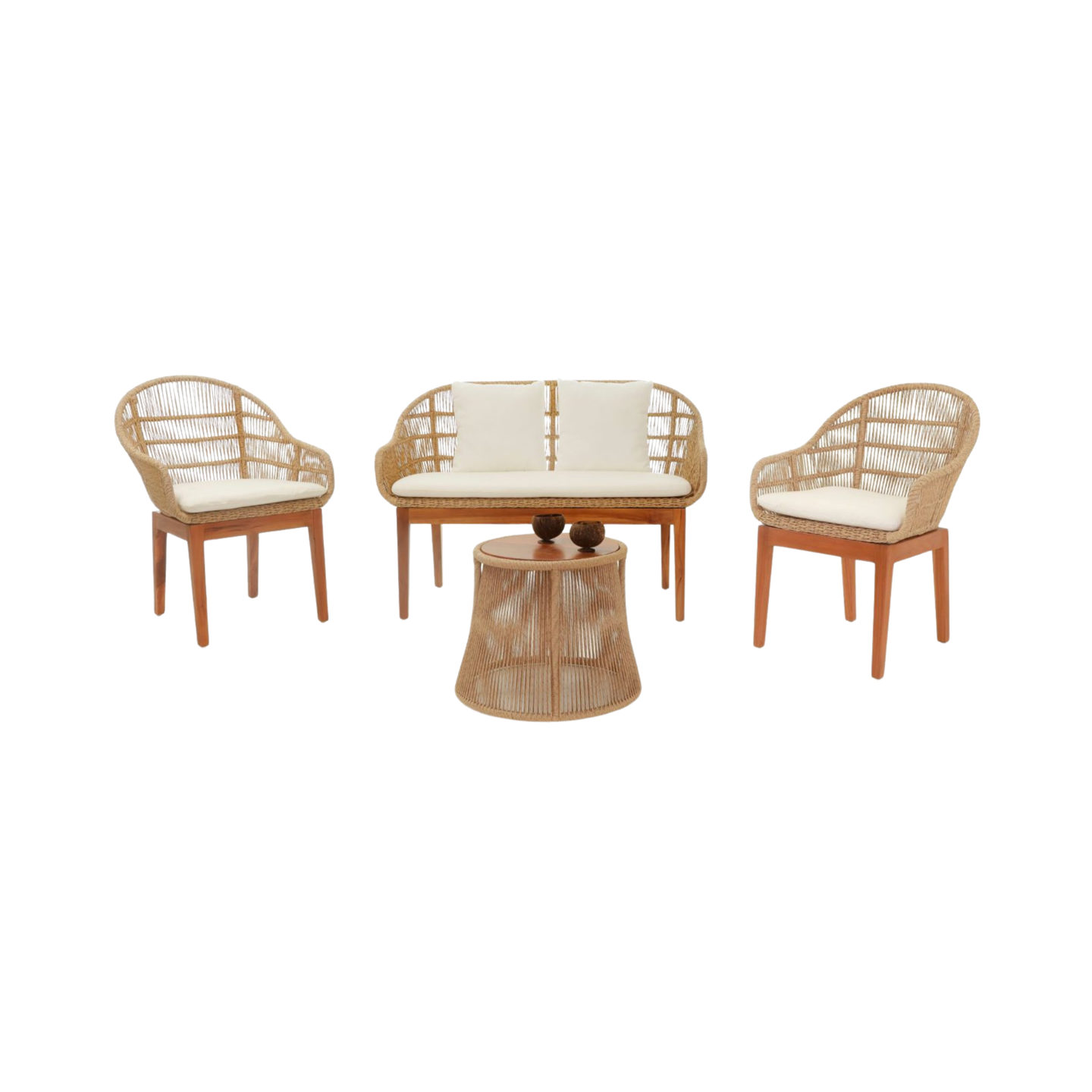 Sala (2pts) s/mesa amora. Estructura en aluminio tejido en lazo sintético. Patas en madera teca. Cojínería elaborada en tela para uso exterior.