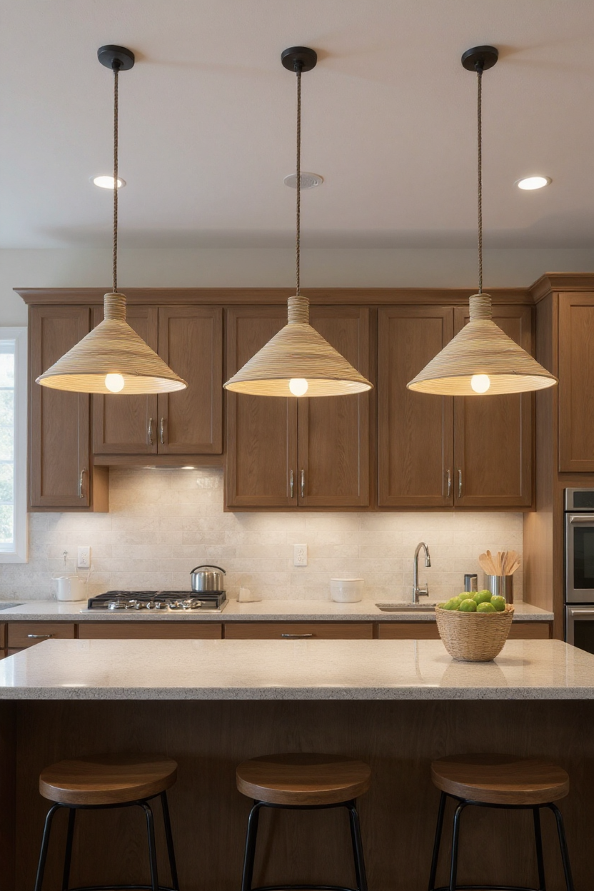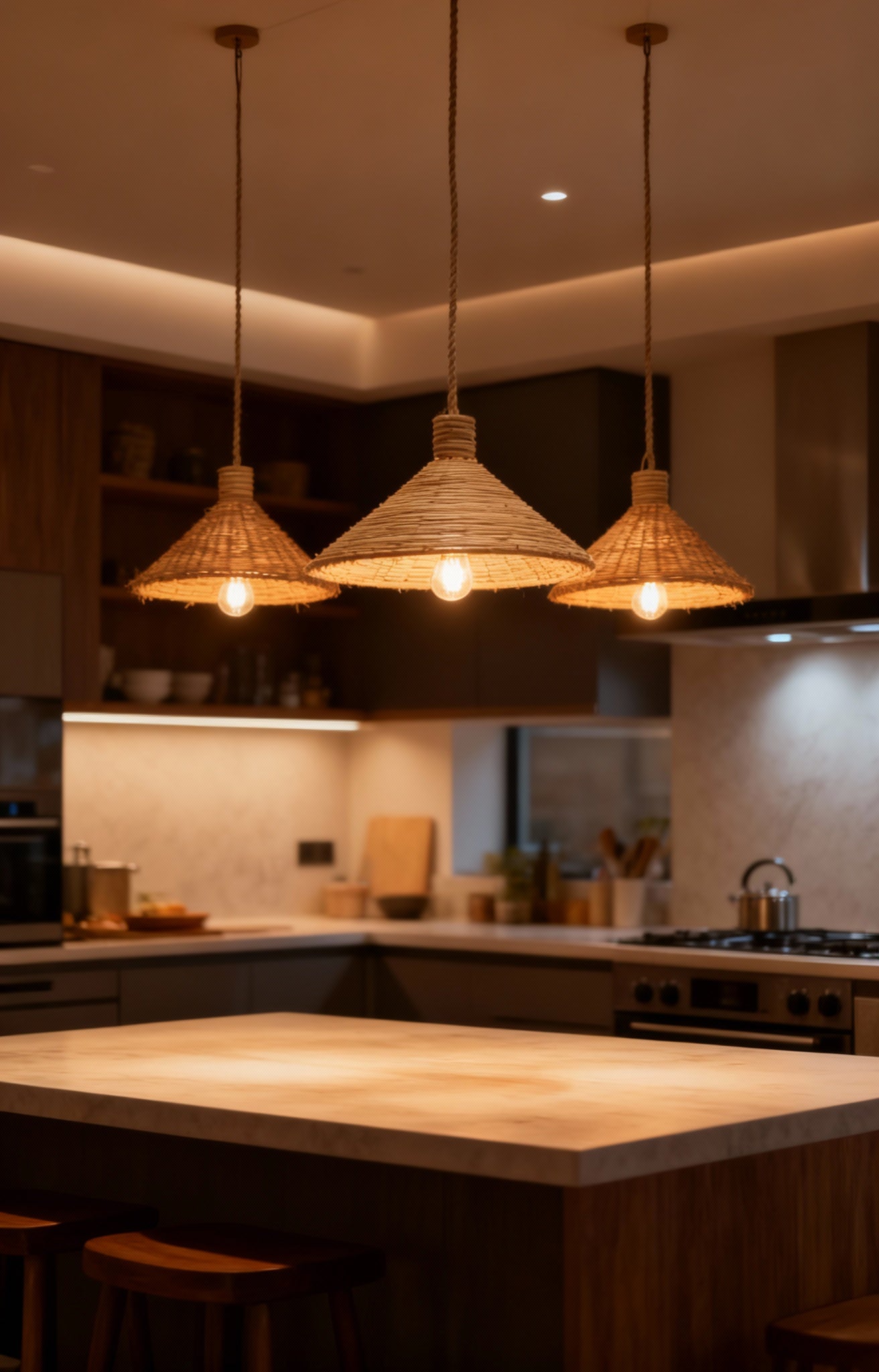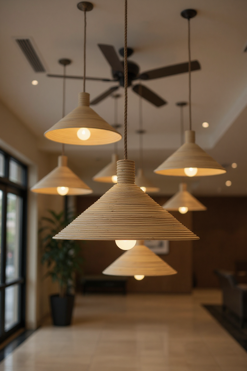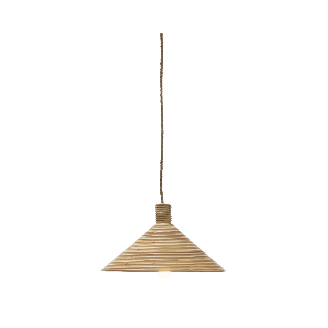 Lámpara colgante diámetro 50Cono. Pieza elaborada en vara de rattan.