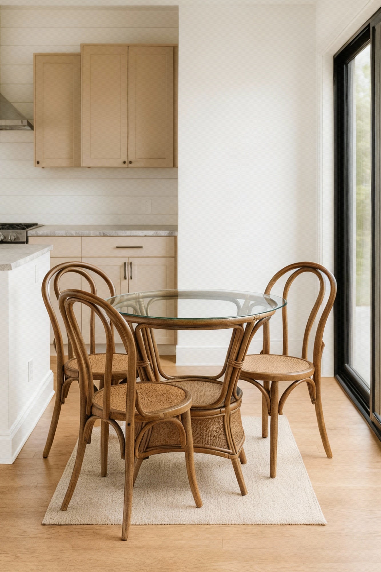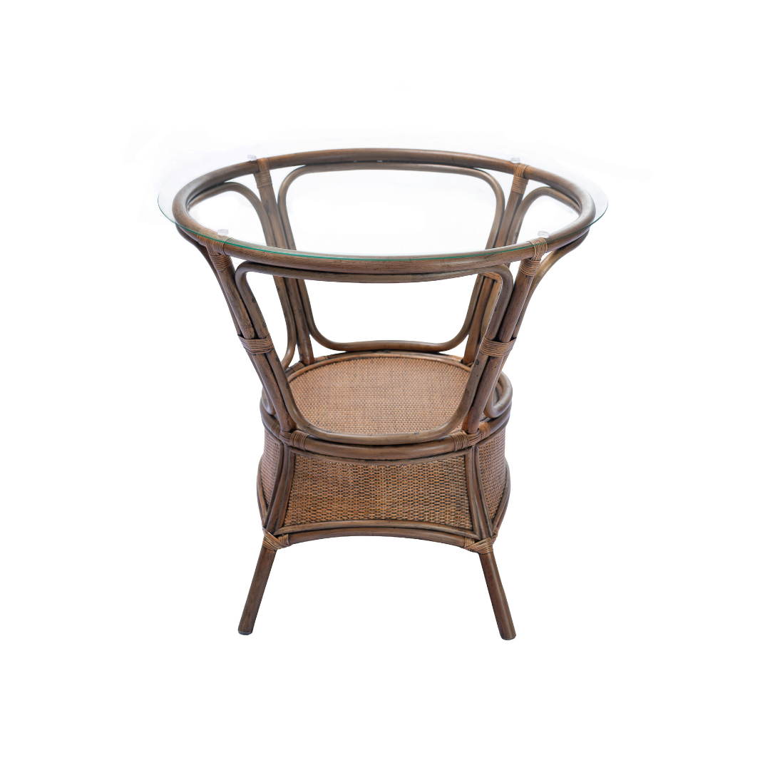 Mesa comedor color anticado Antalya. Estructura en vara de rattan natural y tejido en cáscara de rattan natural. Incluye vidrio