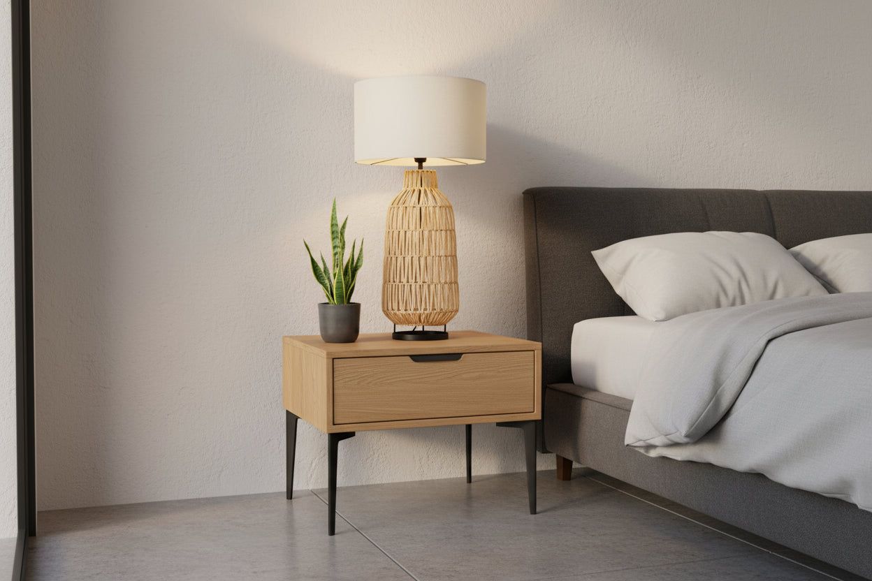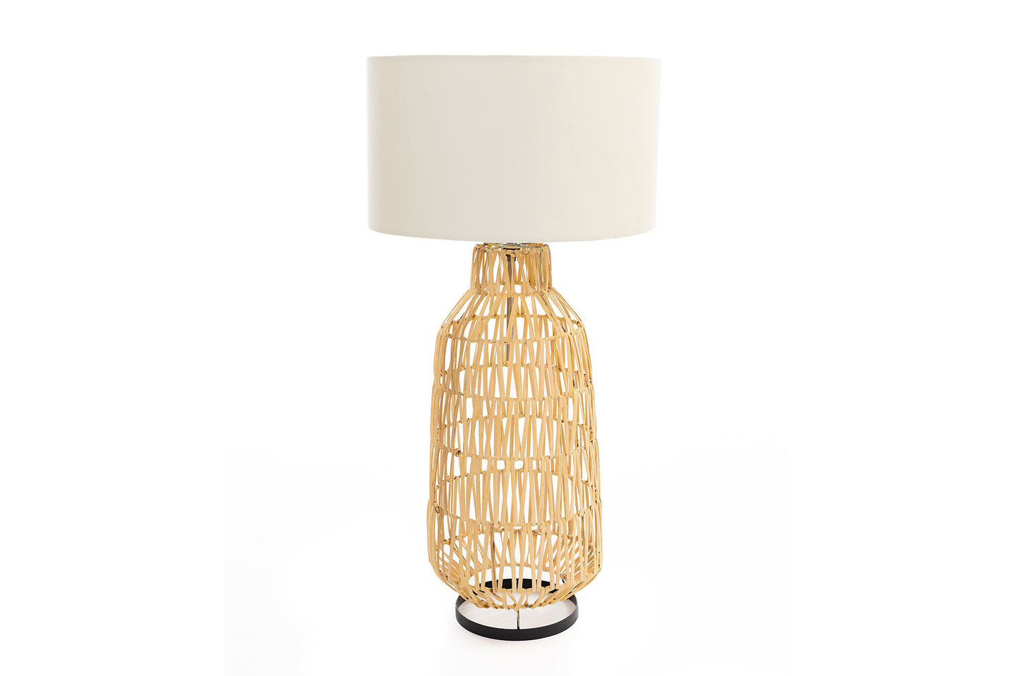 Lámpara de mesa 40cm arod. Lámpara elaborada en vara de rattan con base en hierro y caperuza en tela crudo.