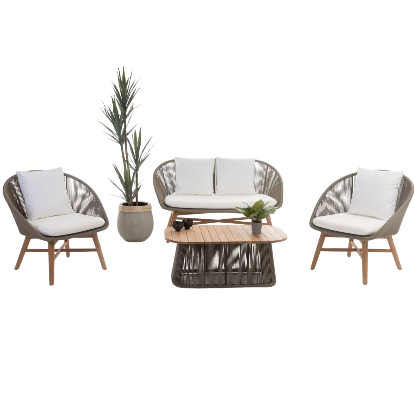 Sala (2 pts) taupe intemp aru. Estructura en aluminio tejido en lazo sintético. Patas en madera teca, superficie de la mesa de centro en madera teca y Cojínería elaborada en tela para uso exterior.
