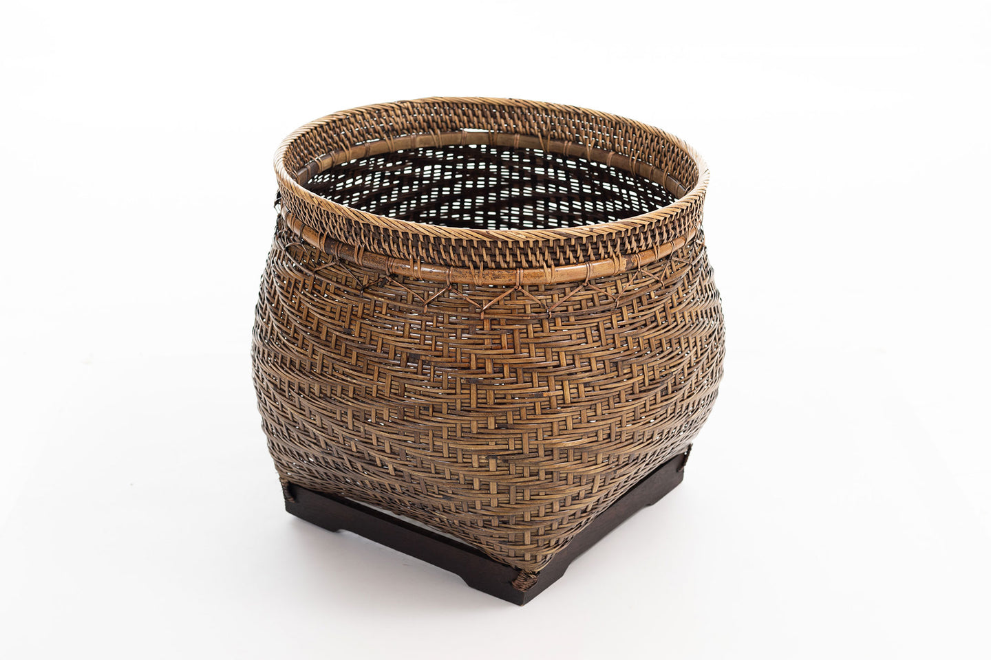 Canasto redondo corto natural baguio. Canasto tejido en cáscara de rattan, base en madera.