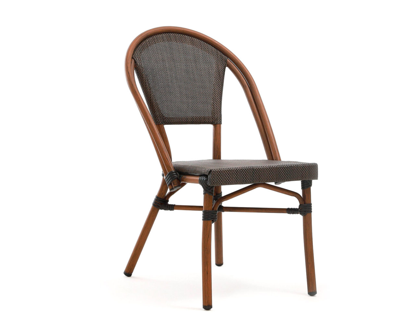 Silla bar sin brazos negra barista. Estructura en aluminio, sentadero y espaldar en textileno, nudos en rattan sintético.
