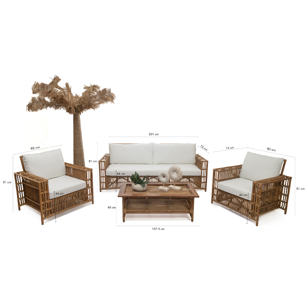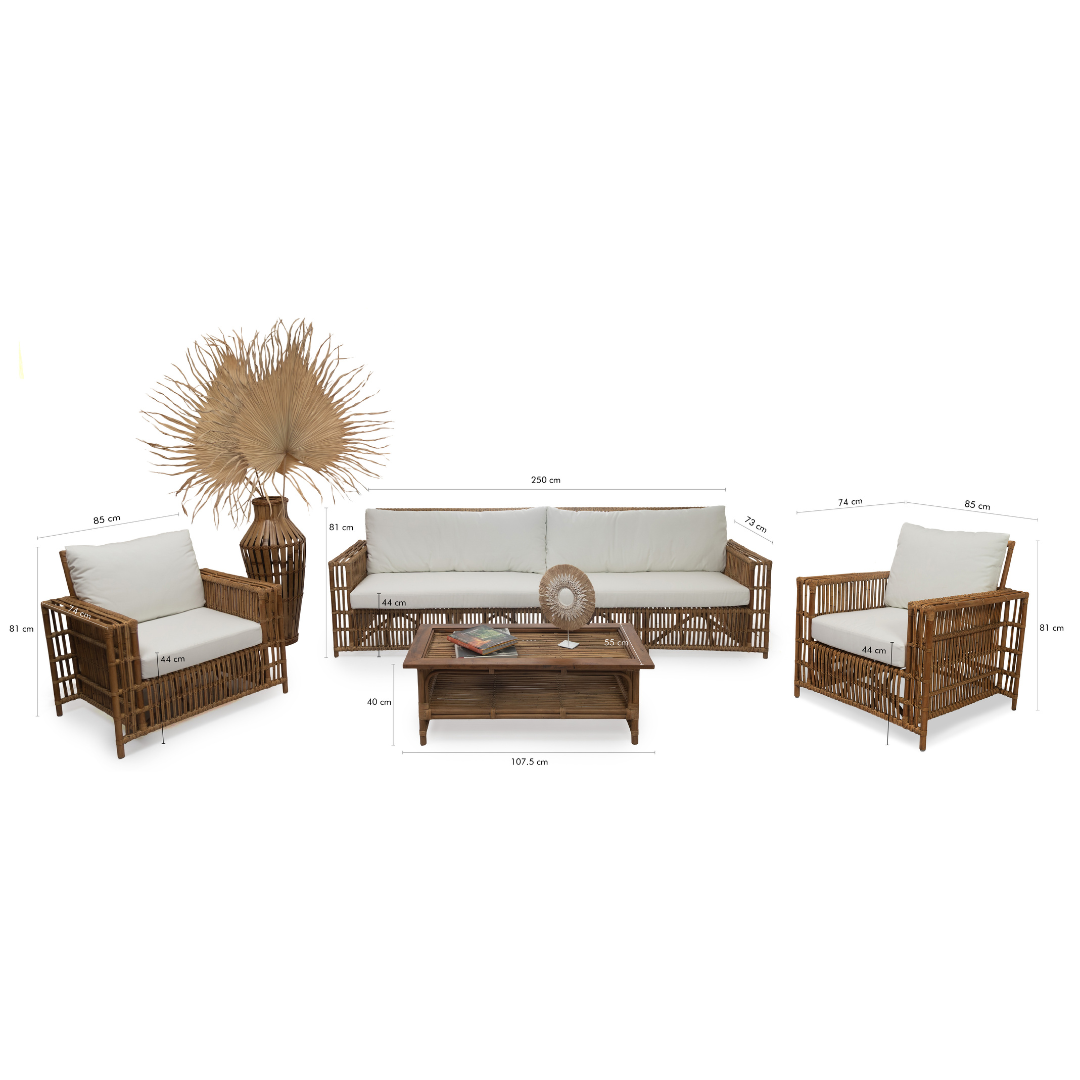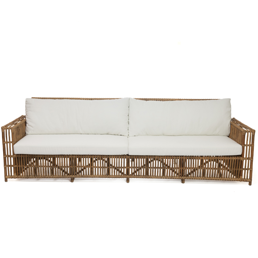 Sofá de 4 puestos color anticado elaborado en vara de rattan natural y nudos en cáscara de rattan. Incluye cojinería