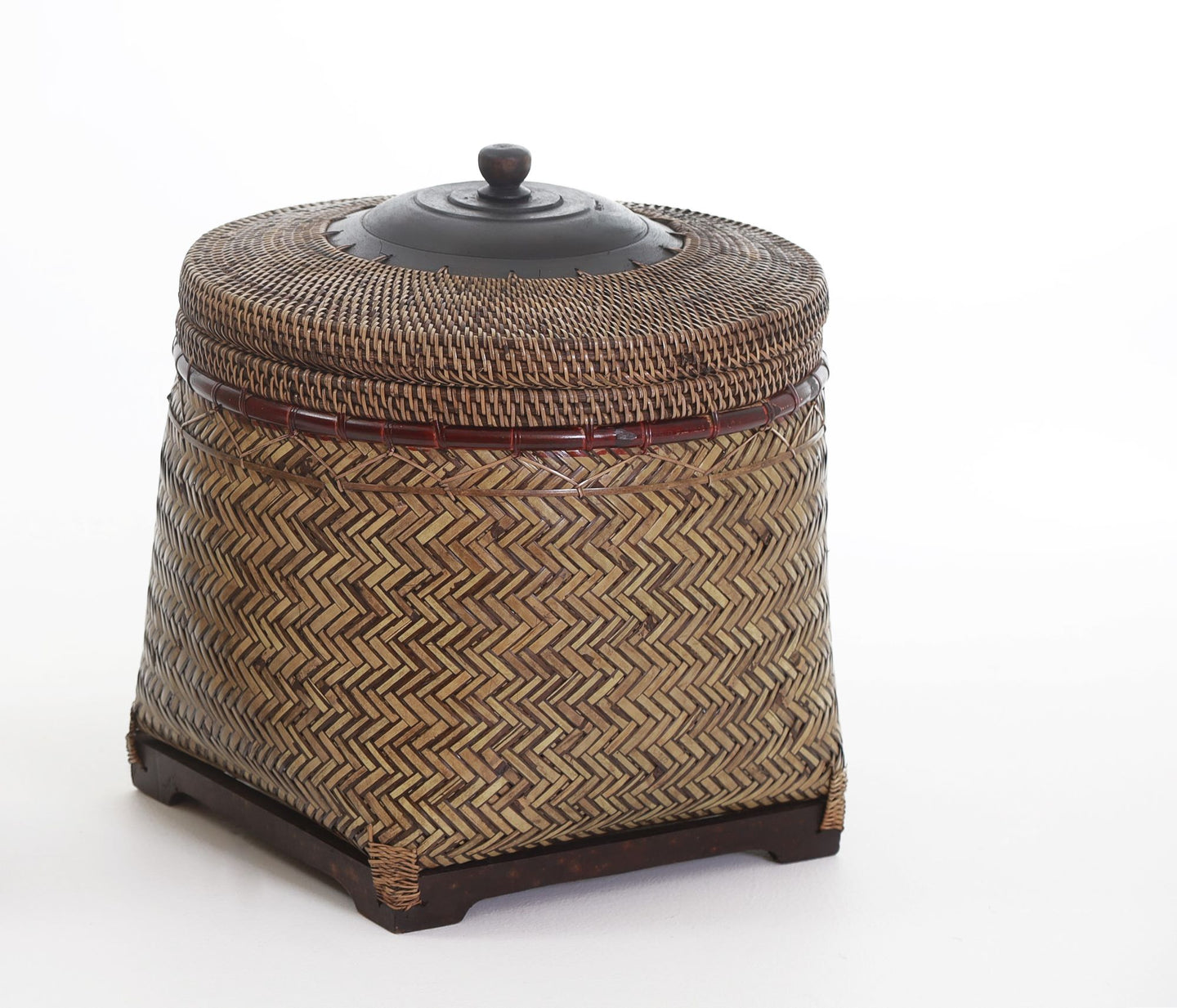 Canasto m con tapa natural betul. Canasto elaborado en cáscara de rattan con base en madera.