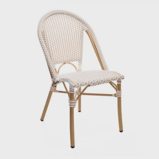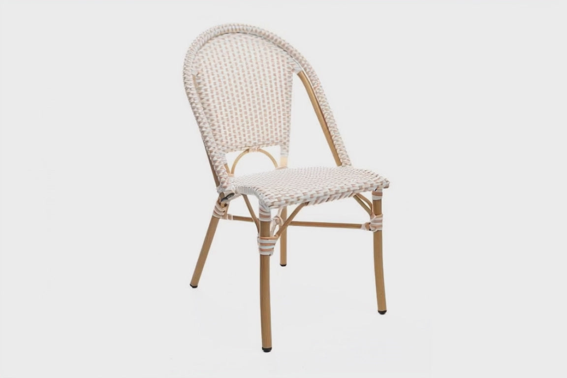 Silla comedor sin brazos blanco beige blend. Estructura en aluminio, sentadero y espaldar en rattan sintético. Apilables de a 10 unidades.