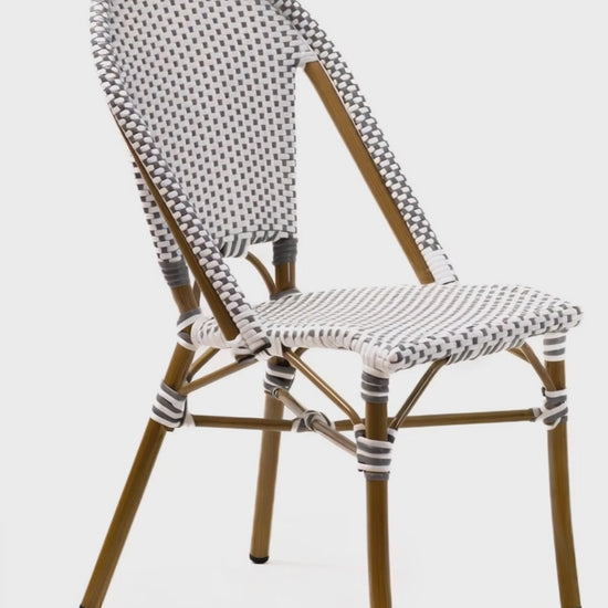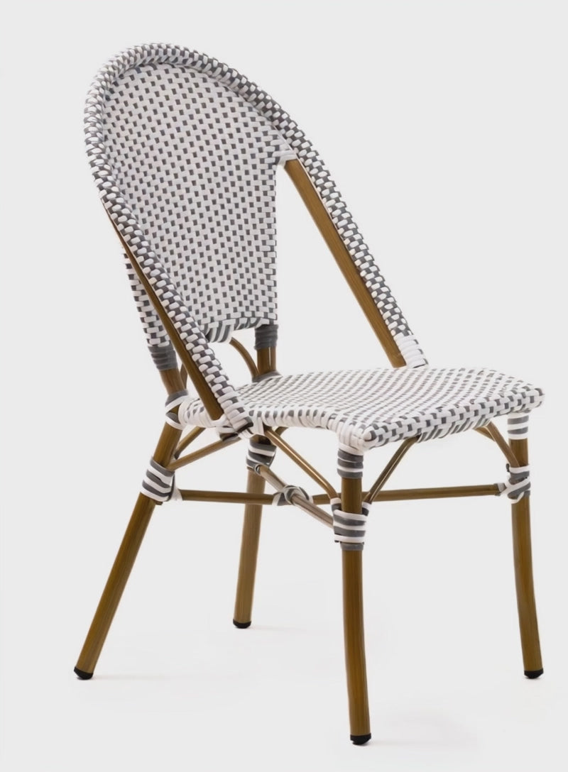 Silla comedor sin brazos blc/gr blend. Estructura en aluminio, sentadero y espaldar en rattan sintético. Apilables de a 10 unidades.