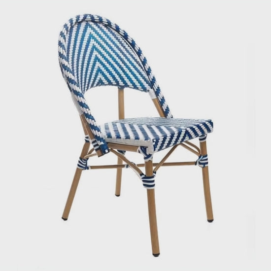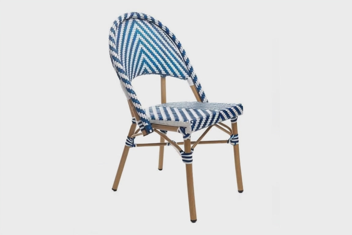 Silla comedor sin brazos blc/az chemex. Estructura en aluminio, sentadero y espaldar en rattan sintético. Apilables de a 10 unidades.