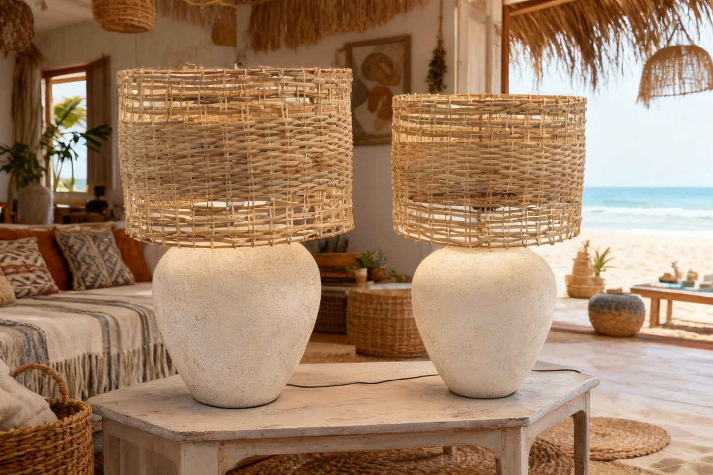 Lámpara en trrcta pequeña a29 dasha. Lámpara elaborada en microcemento y caperuza tejida en cáscara de rattan.
