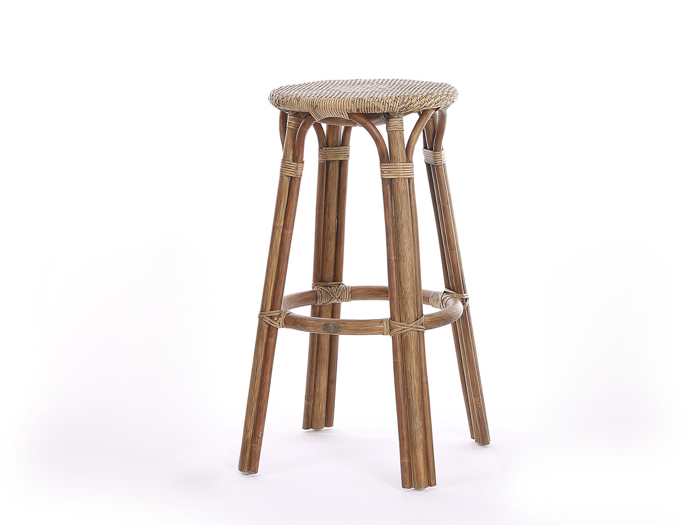 Butaco alto sin espaldar anticado elise. Estructura en vara de rattan, tejido en cáscara de rattan.