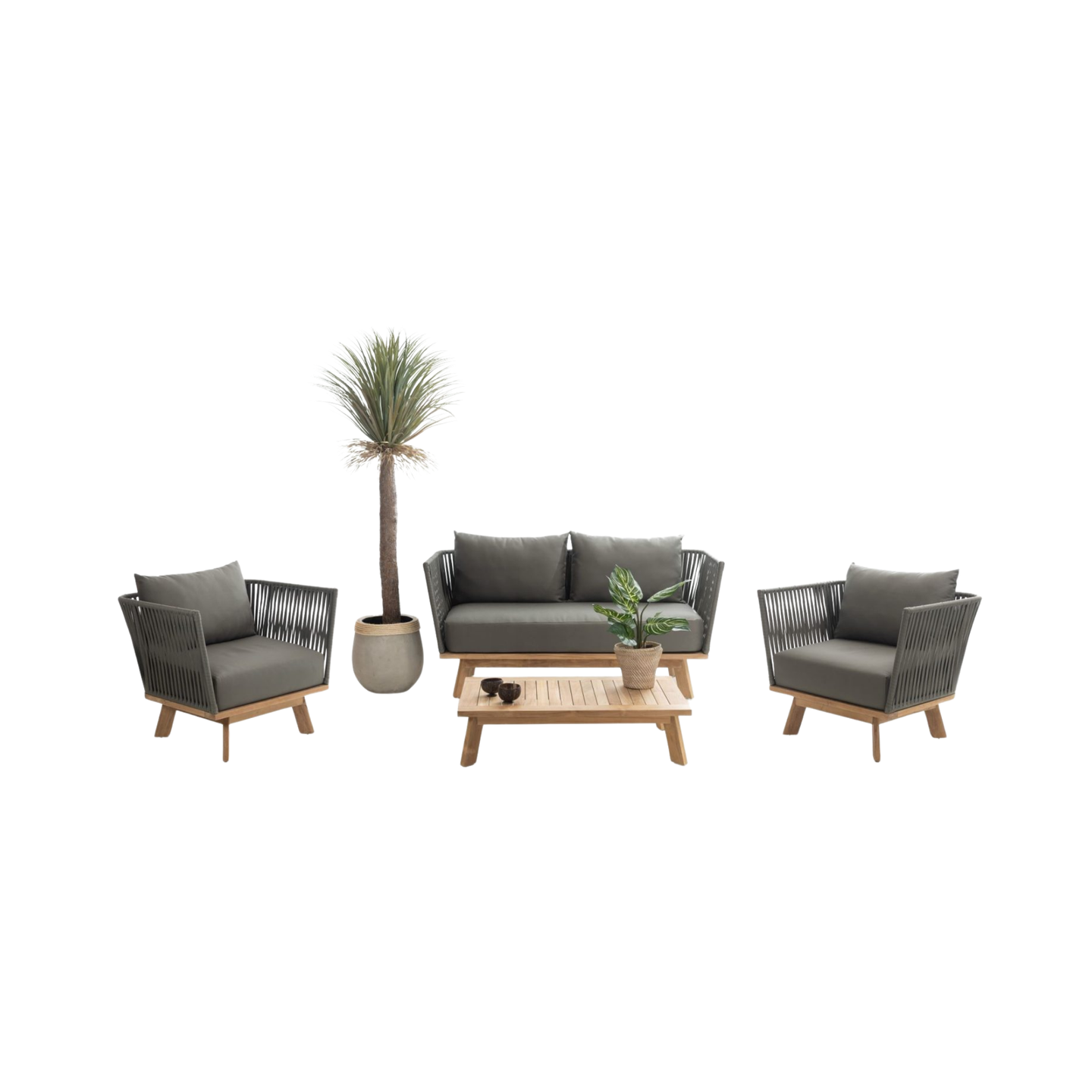 Sala (2 pts) gris intemp ella. Estructura en aluminio, tejido en lazo sintético. Patas y superficie de la mesa de centro en madera teca. Cojínería elaborada en tela para uso exterior.