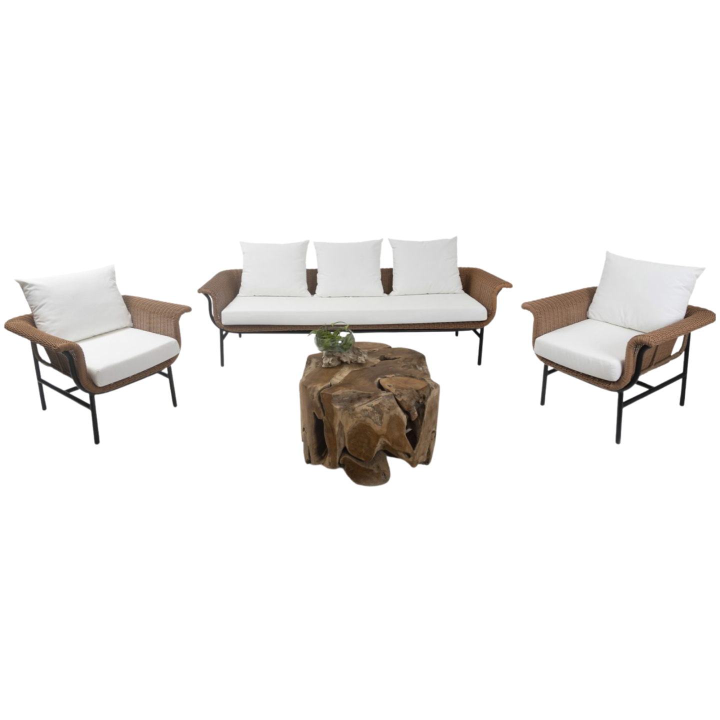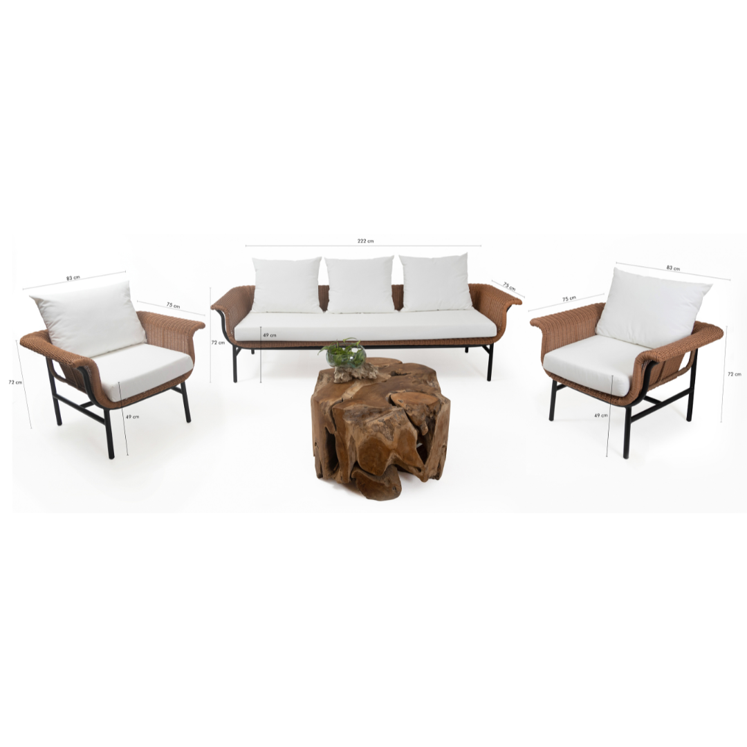 Sala (3 pts) s/mesa nat intemp evora. Estructura en aluminio, tejido en rattan sintético. Cojínería elaborada en tela para uso exterior.