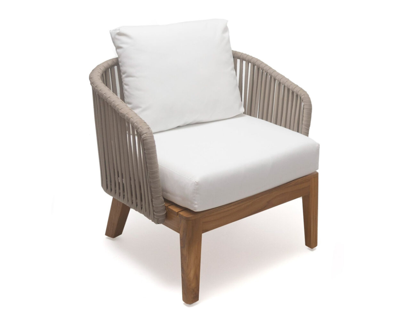 Poltrona intemp faro. Estructura en aluminio, tejido el lazo sintético, patas en madera teca. Cojínería elaborada en tela para uso exterior.