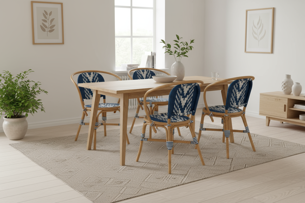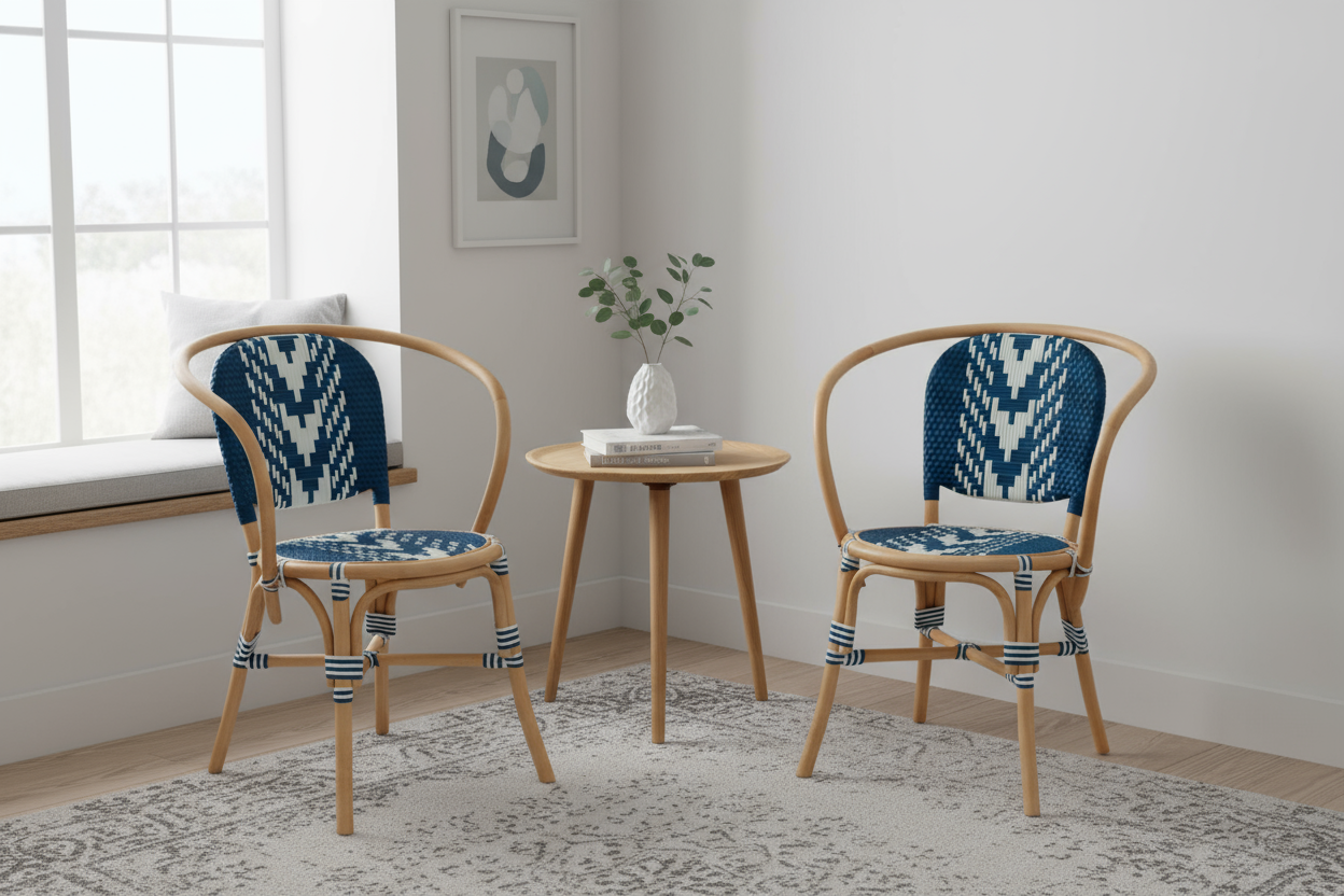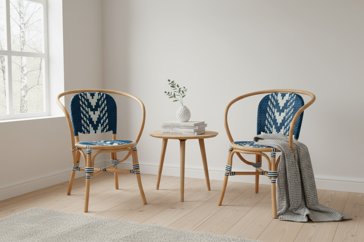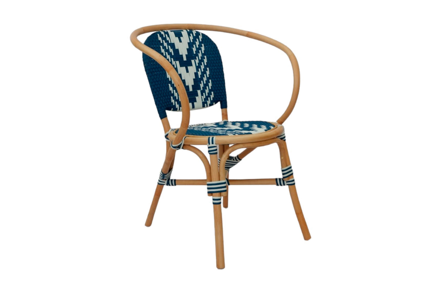Silla comedor con brazos blc/az fia Bistro. Estructura en vara de rattan, tejido en rattan sintético. .