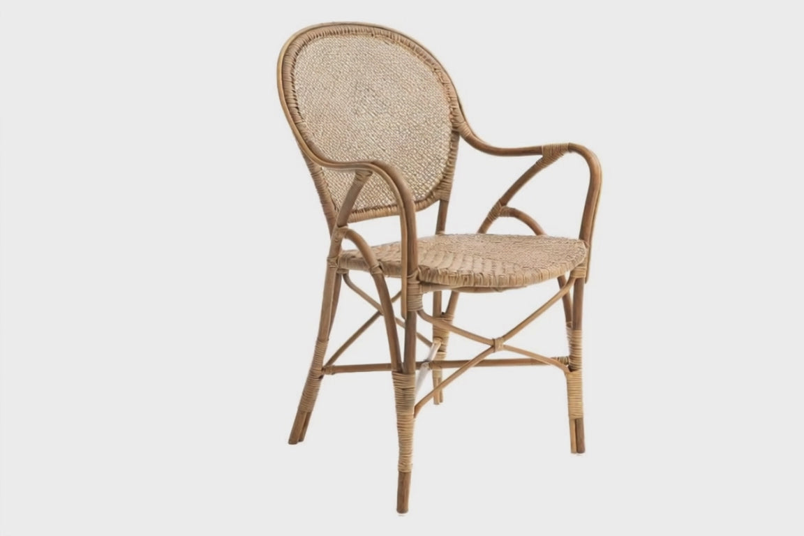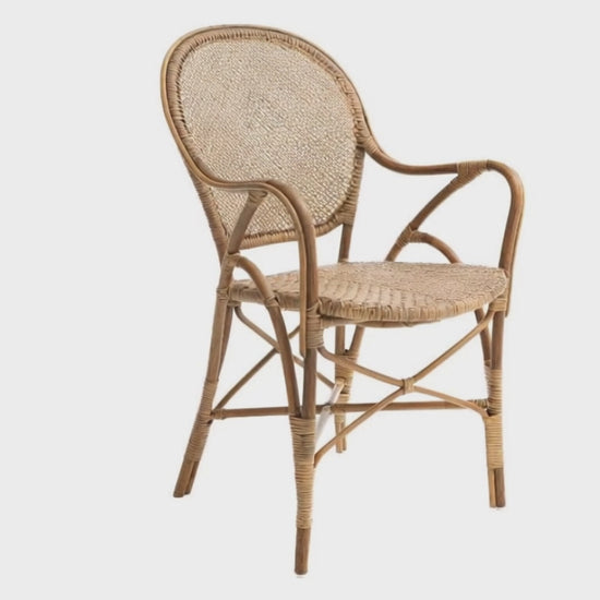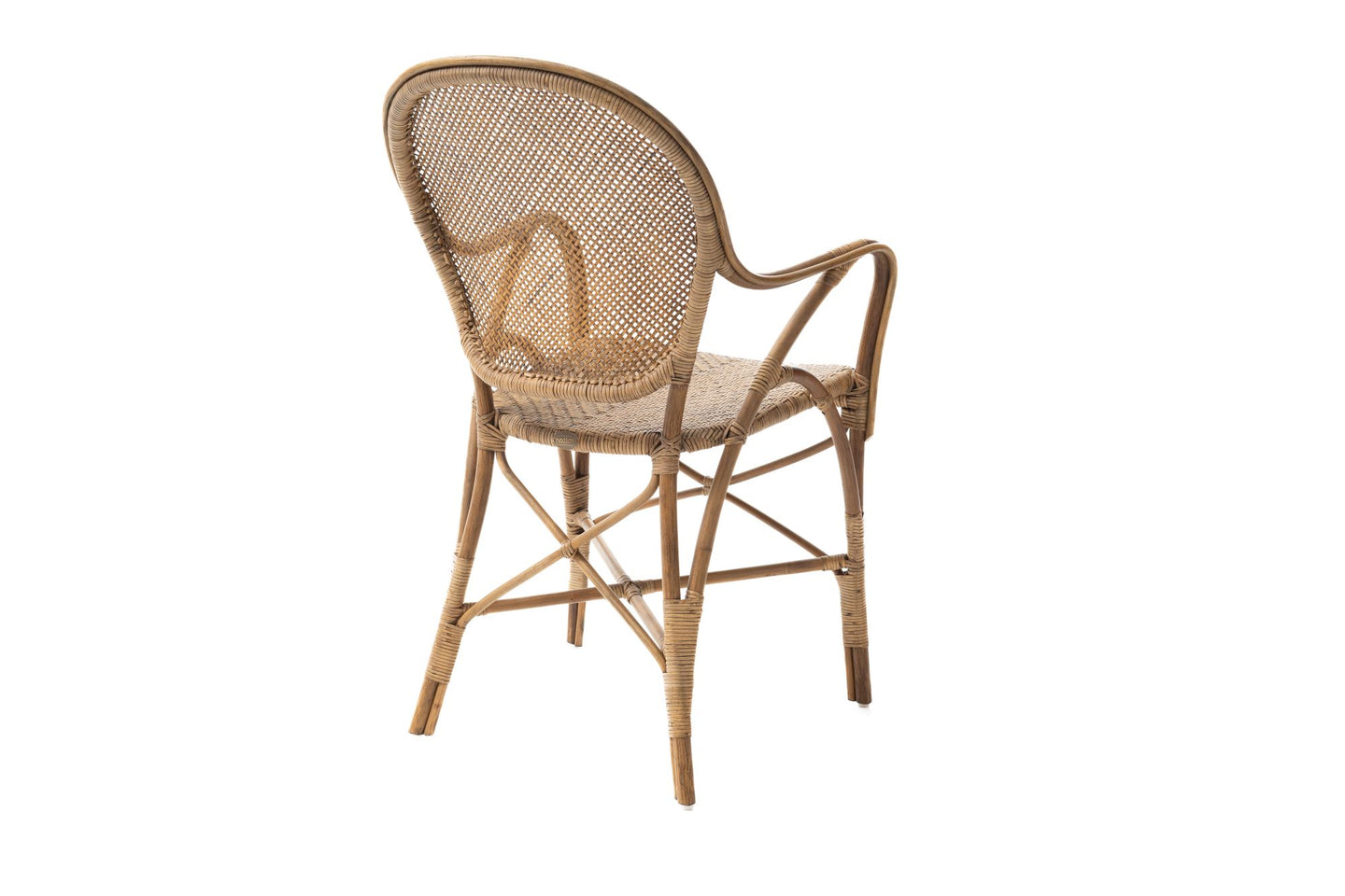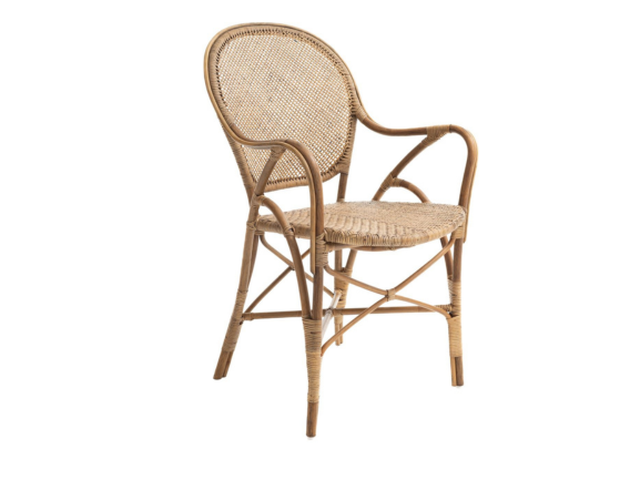 Silla comedor con brazos anticado gea. Estructura en vara de rattan sin corteza. Sentadero y espaldar tejidos en cáscara de rattan.