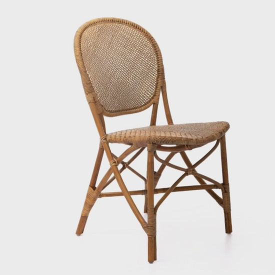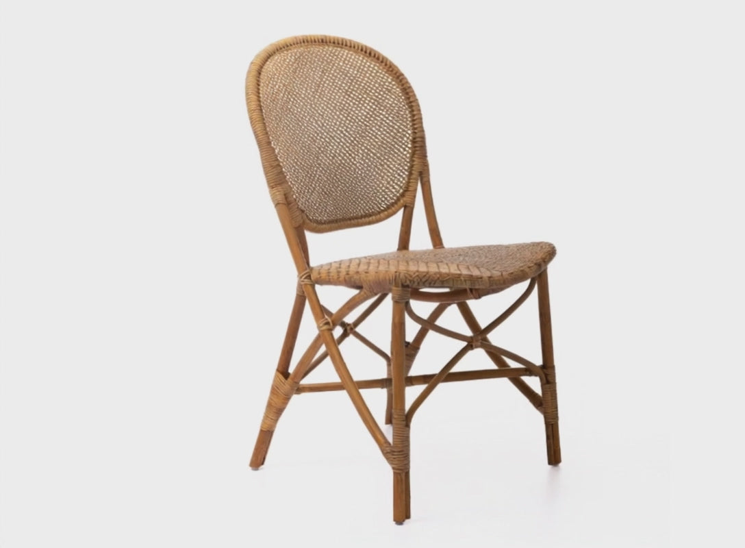 Silla comedor sin brazos anticado gea. Estructura en vara de rattan sin corteza. Sentadero y espaldar tejidos en cáscara de rattan.