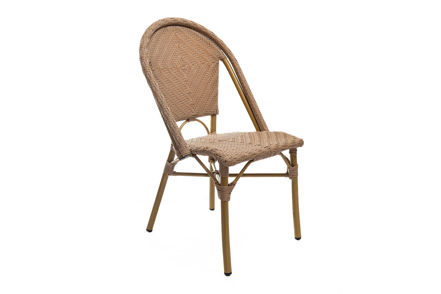 Silla comedor sin brazos khaki glace. Estructura en aluminio, sentadero y espaldar en rattan sintético. Apilables de a 10 unidades.