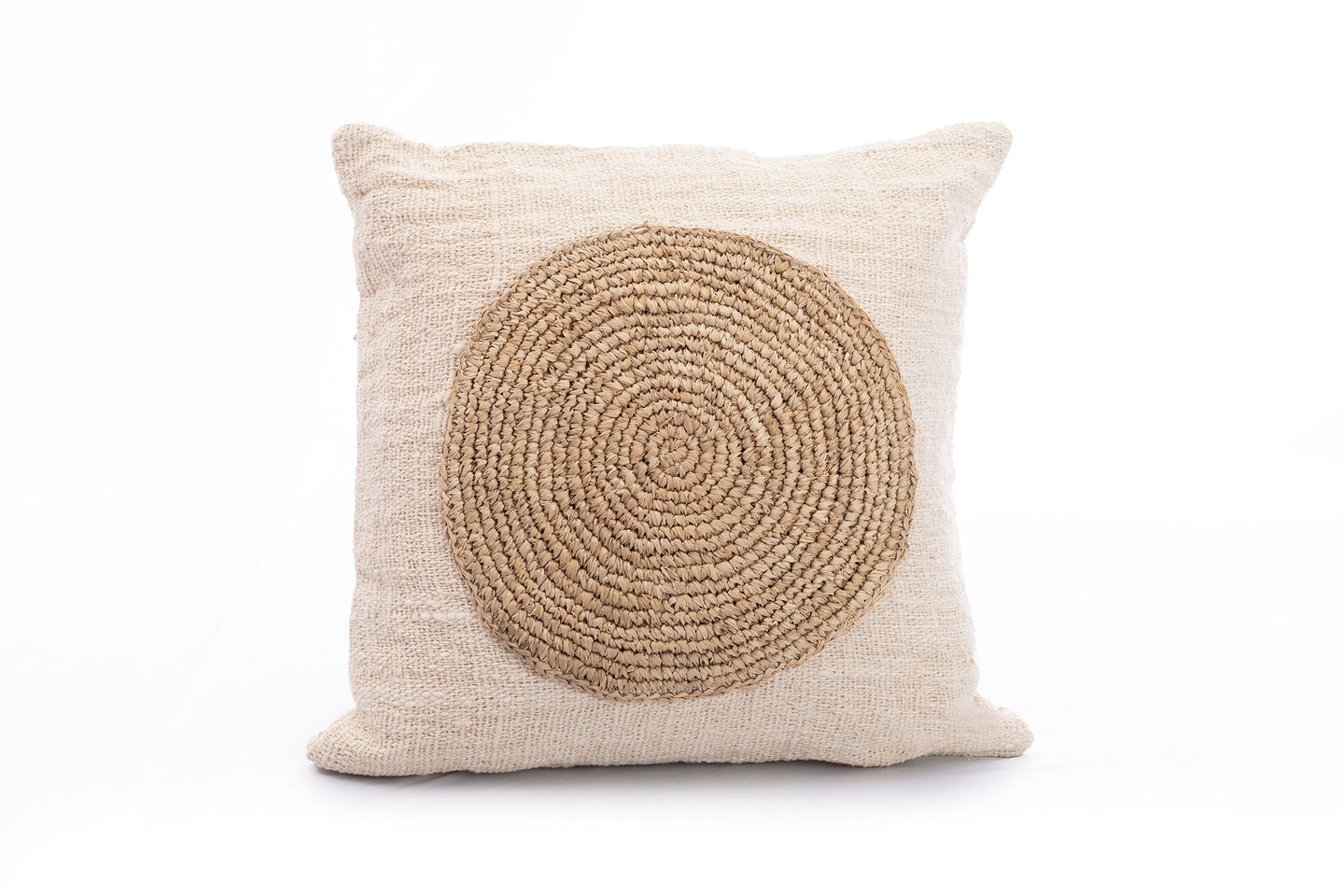 Cojín alg crd circ senc rafia 50x50 hmya. Elaborado en algodón y decorativo en rafia.