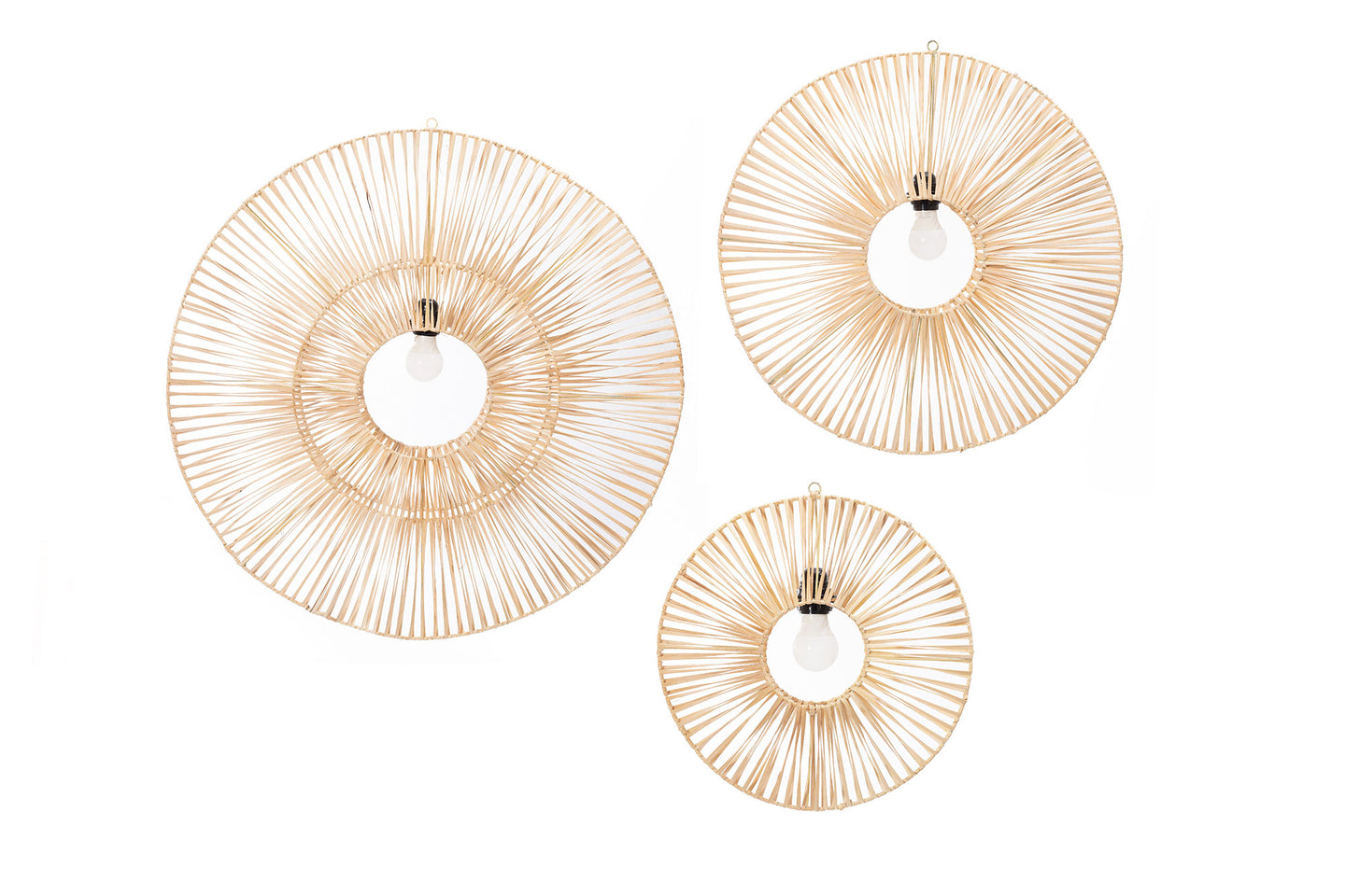 Lámpara colgante d40 s idril. Estructura en aluminio, tejido en cáscara de rattan.