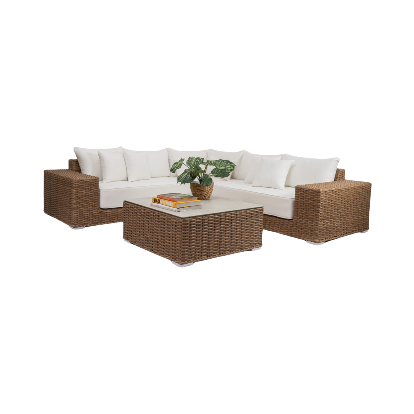 Sala modular con estructura en aluminio y tejido en rattan sintético. Incluye cojinería y vidrio.
