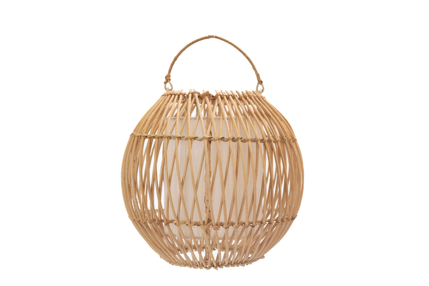 Farol en rattan kurma. Estructura en aluminio, tejido en vara de rattan con pantalla interna.