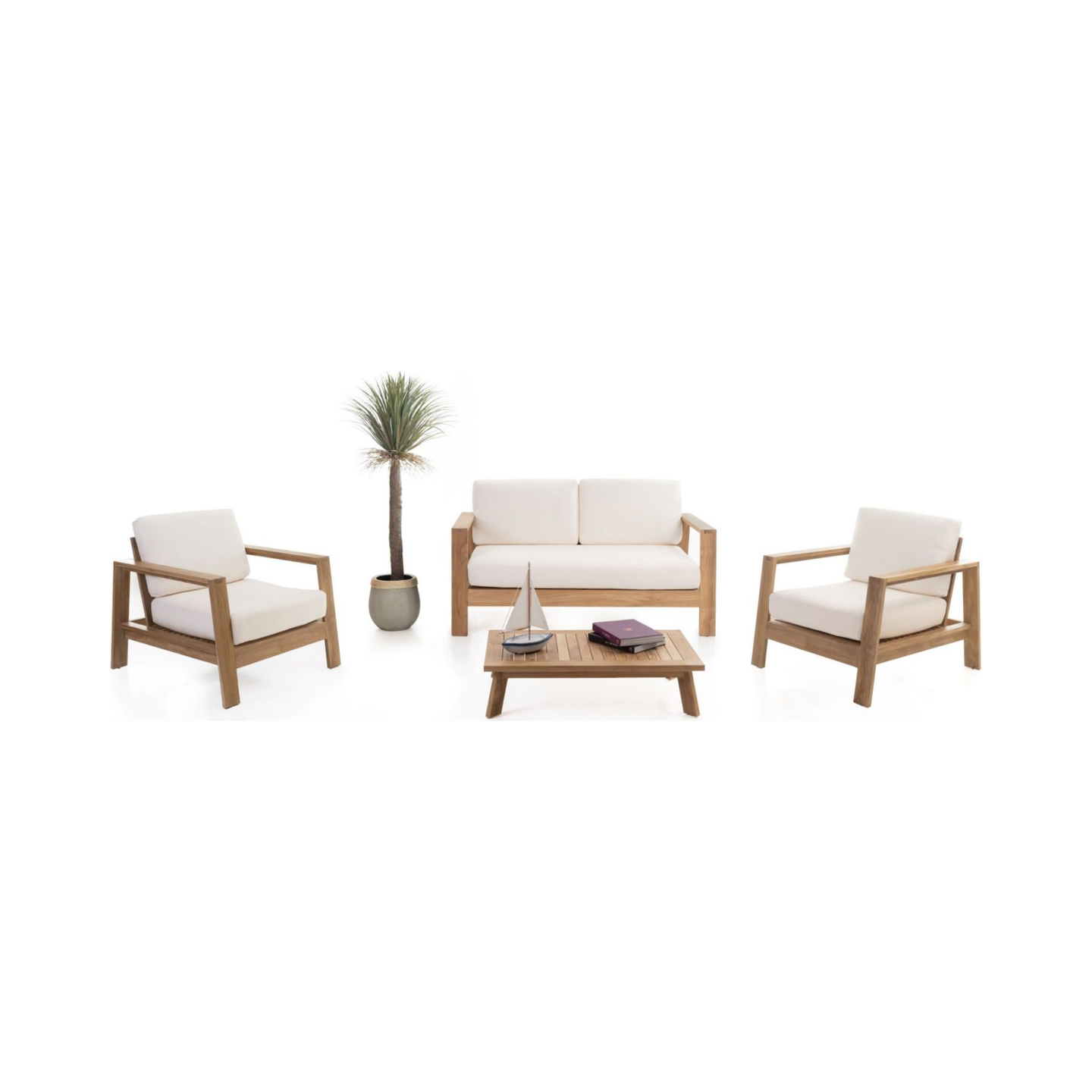 Sala (2 pts) s/mesa nat labuna. Estructura en madera teca. Cojínería elaborada en tela para uso exterior.