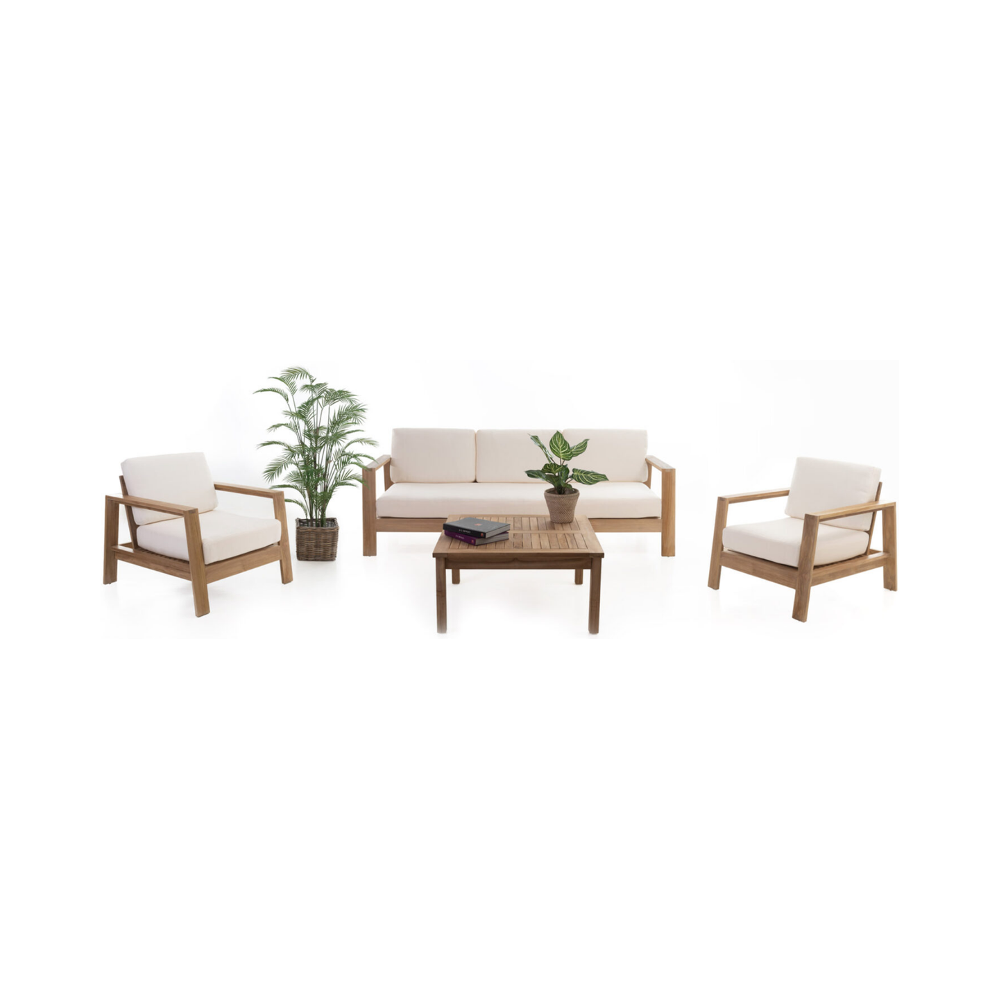 Sala (3 pts) s/mesa nat labuna. Estructura en madera teca. Cojínería elaborada en tela para uso exterior.