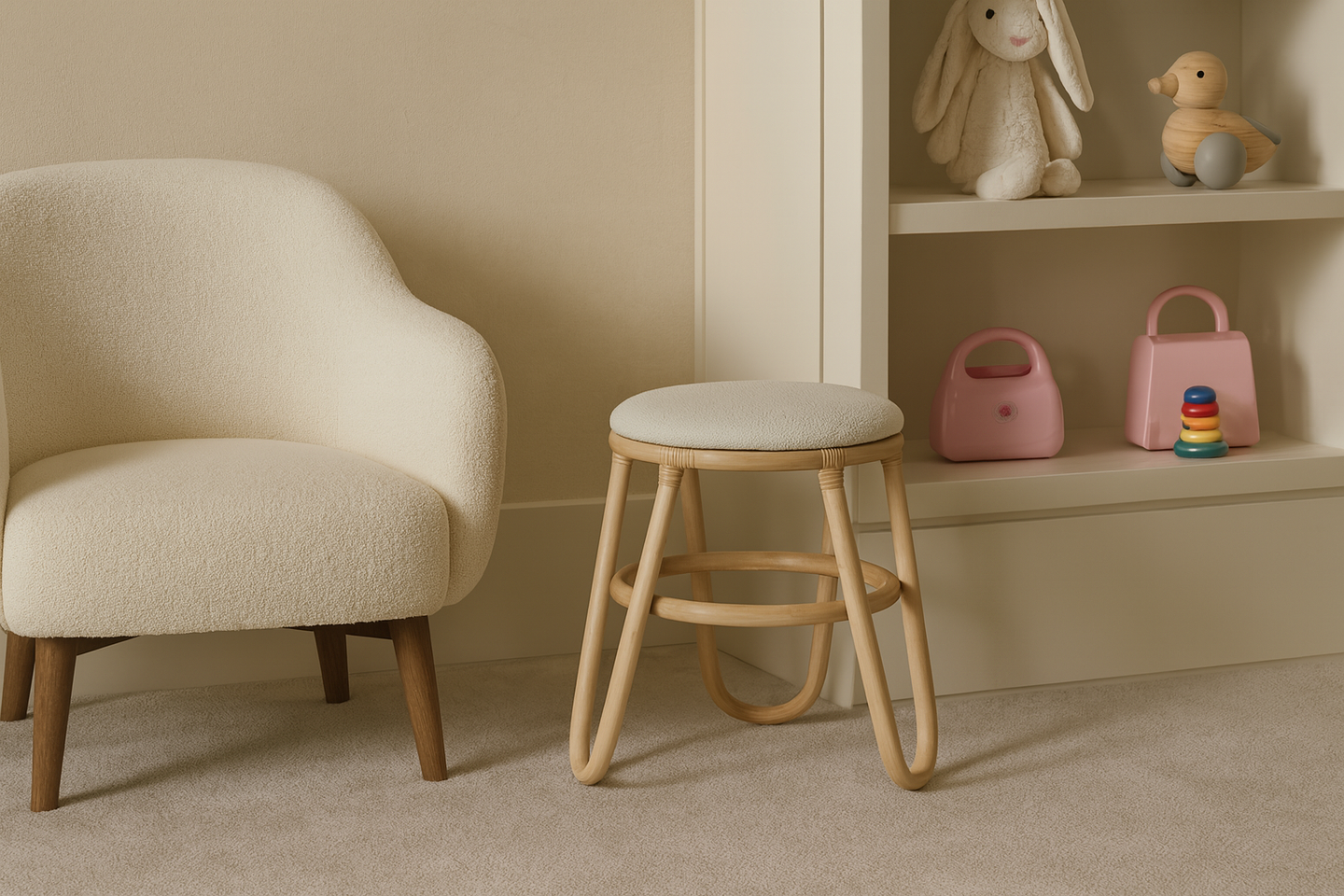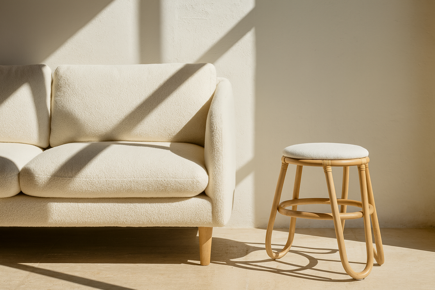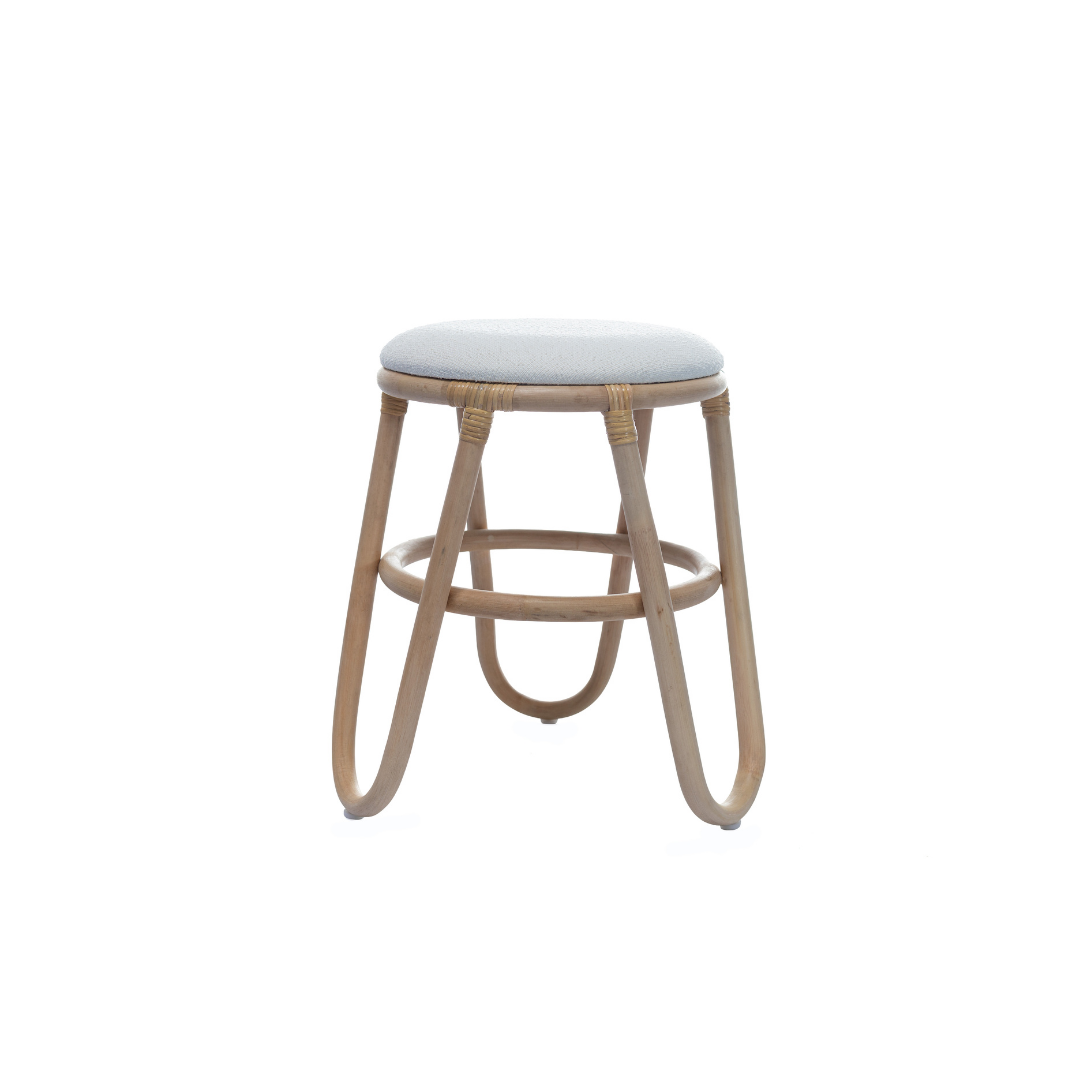 Butaco color natural Laika. Estructura en vara de rattan, sentadero tapizado.