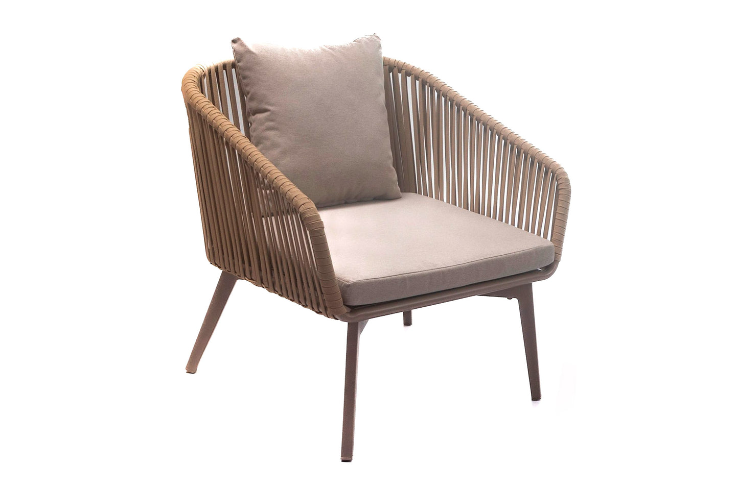 Poltrona khaki latina. Estructura y patas en aluminio, tejido en lazo sintético, Cojínería elaborada en tela para uso exterior.