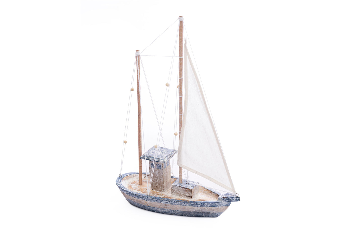 Barco madera tallada c/csa azul l layar. Pieza elaborada en madera tallada.