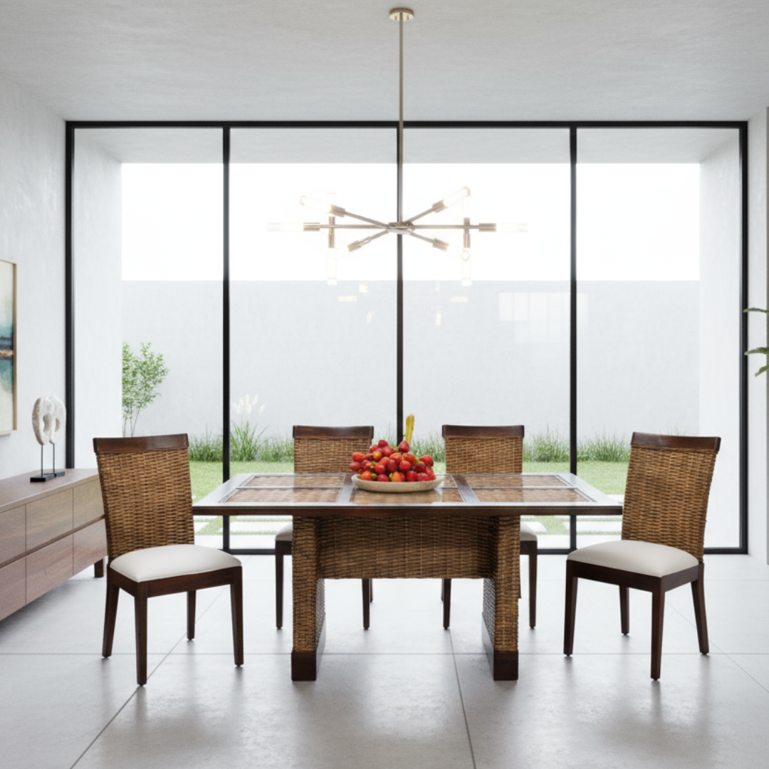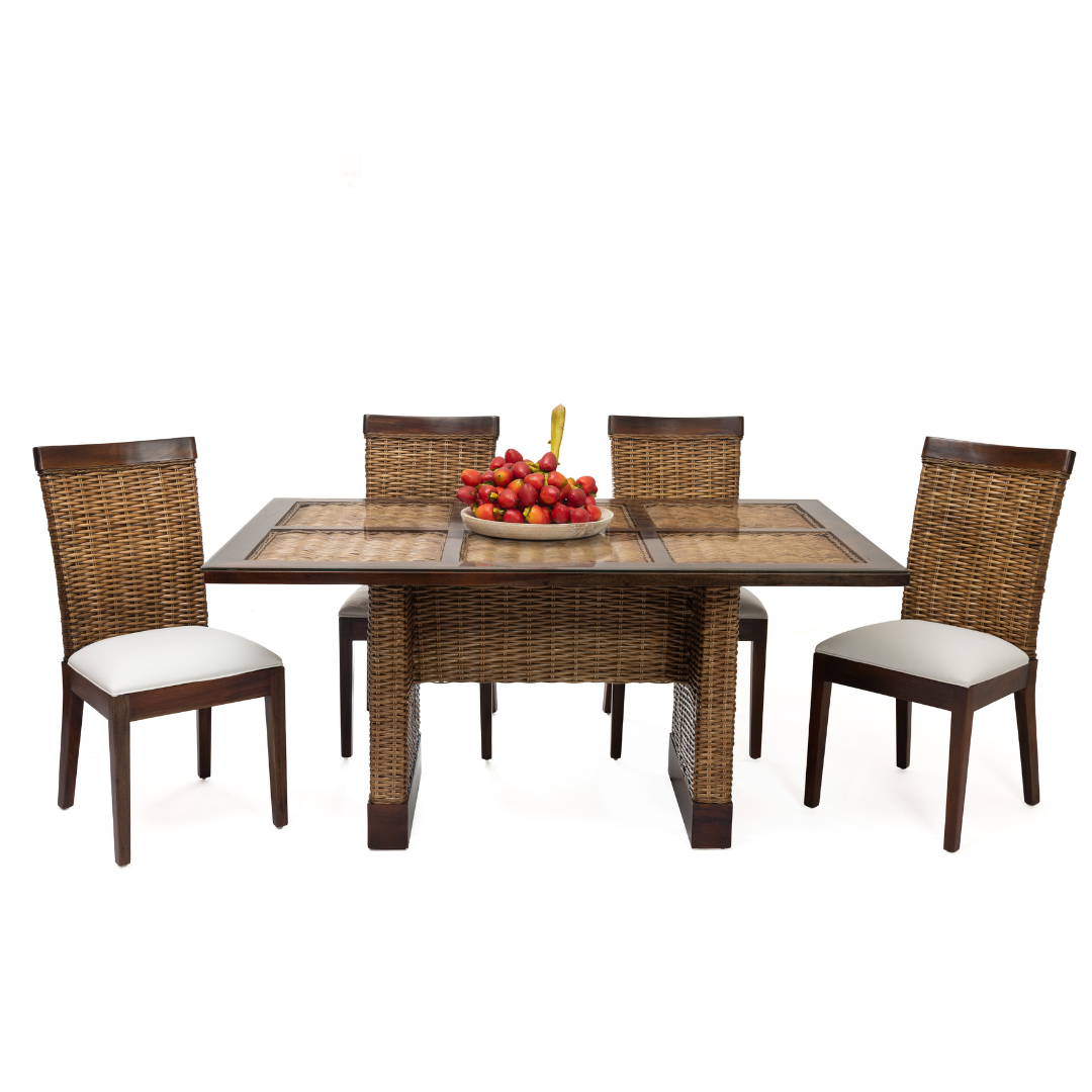 Mesa comedor rectangular. Esstructura en madera caoba, tejido en cáscara de rattan. Incluye vidrio.