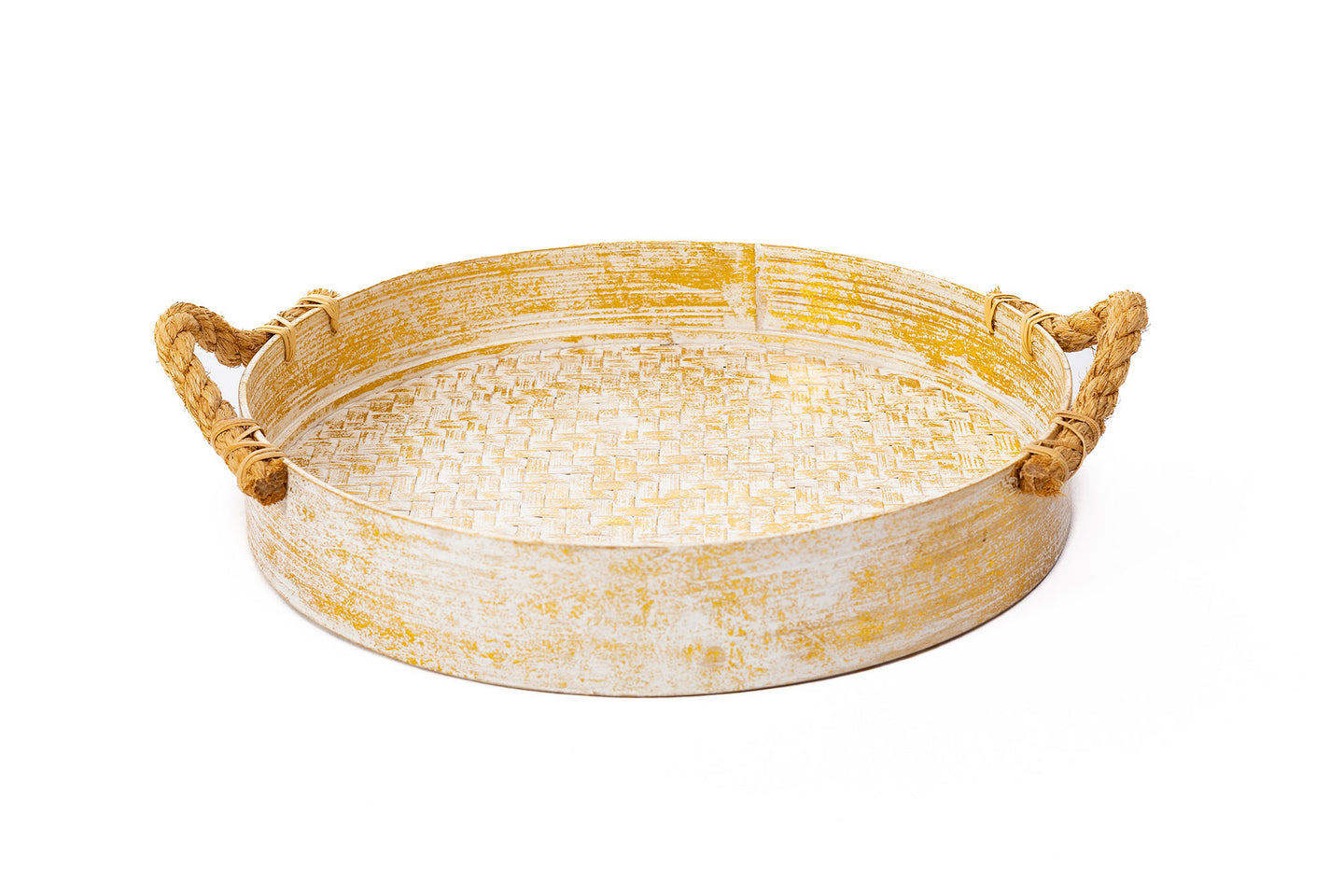 Bandeja red 35cm dorada mindanao. Bandeja elaborada en rattan, agarraderas en cabuya náutica.
