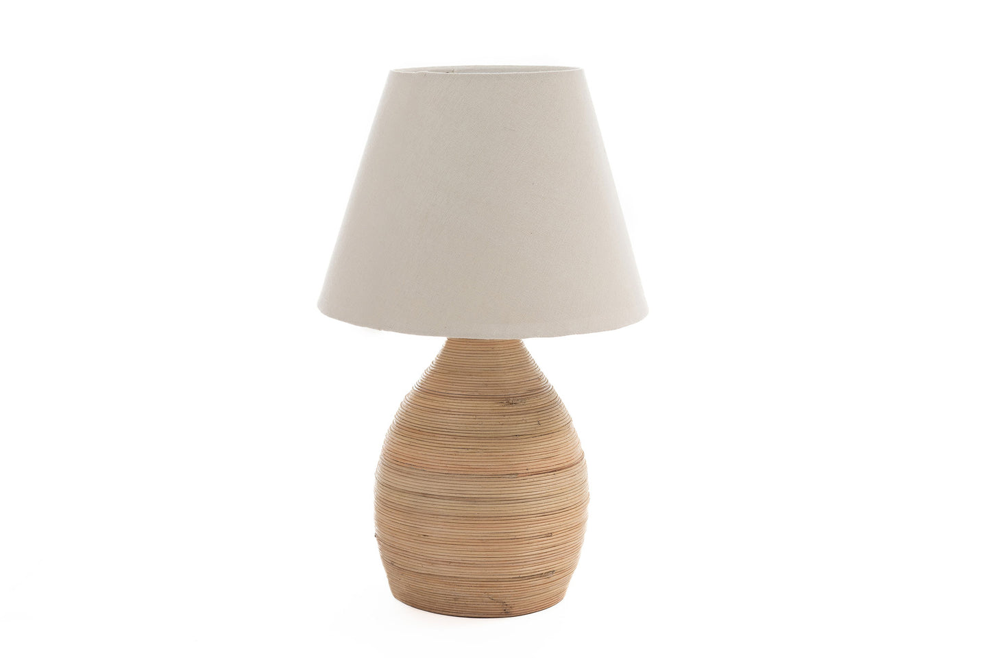 Lámpara en rattan nessa. Lámpara elaborada en vara de rattan con caperuza en tela crudo.