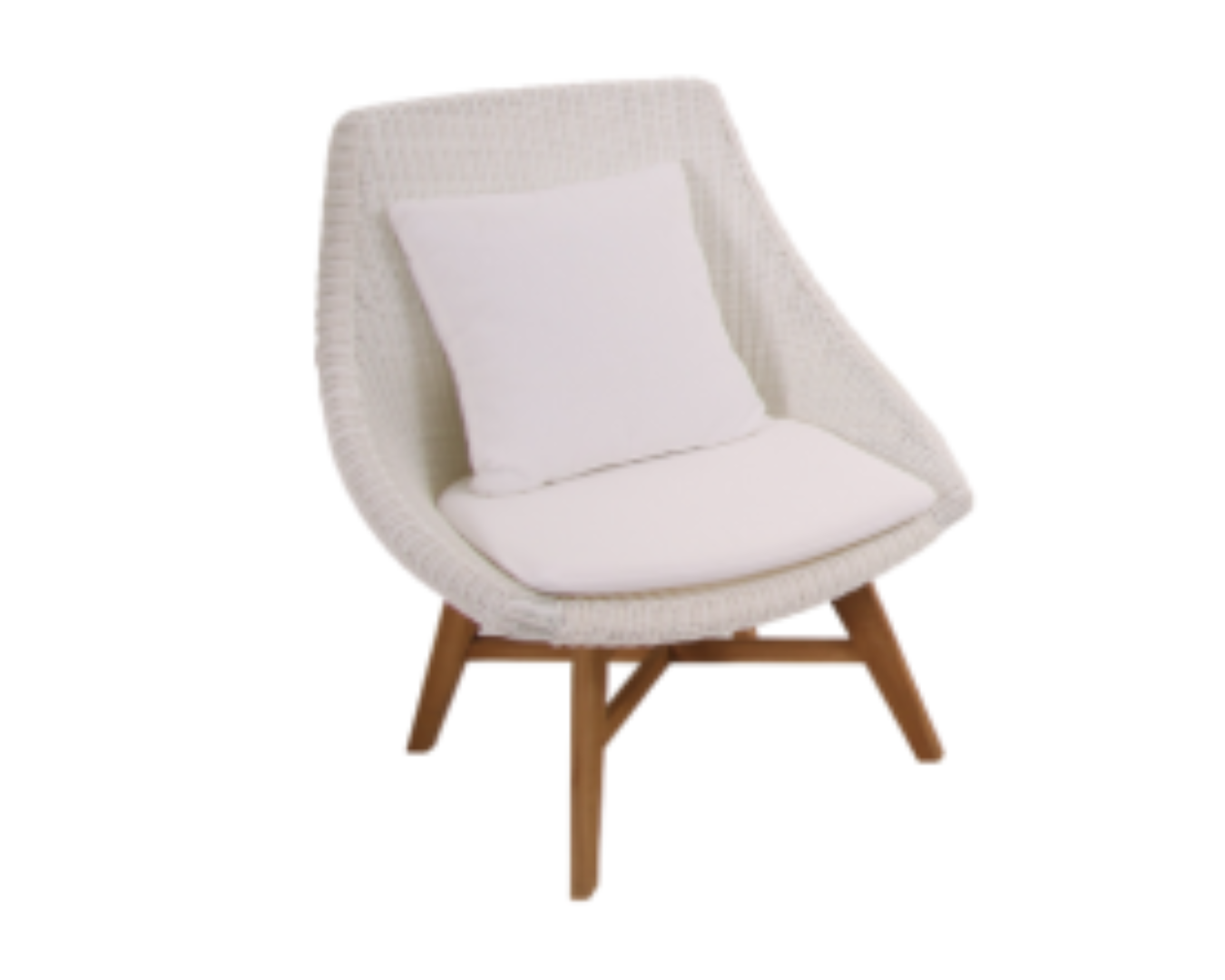 Poltrona w-w intemp obi. Estructura en aluminio, tejido en rattan sintético. Patas en madera teca. Cojínería elaborada en tela para uso exterior.