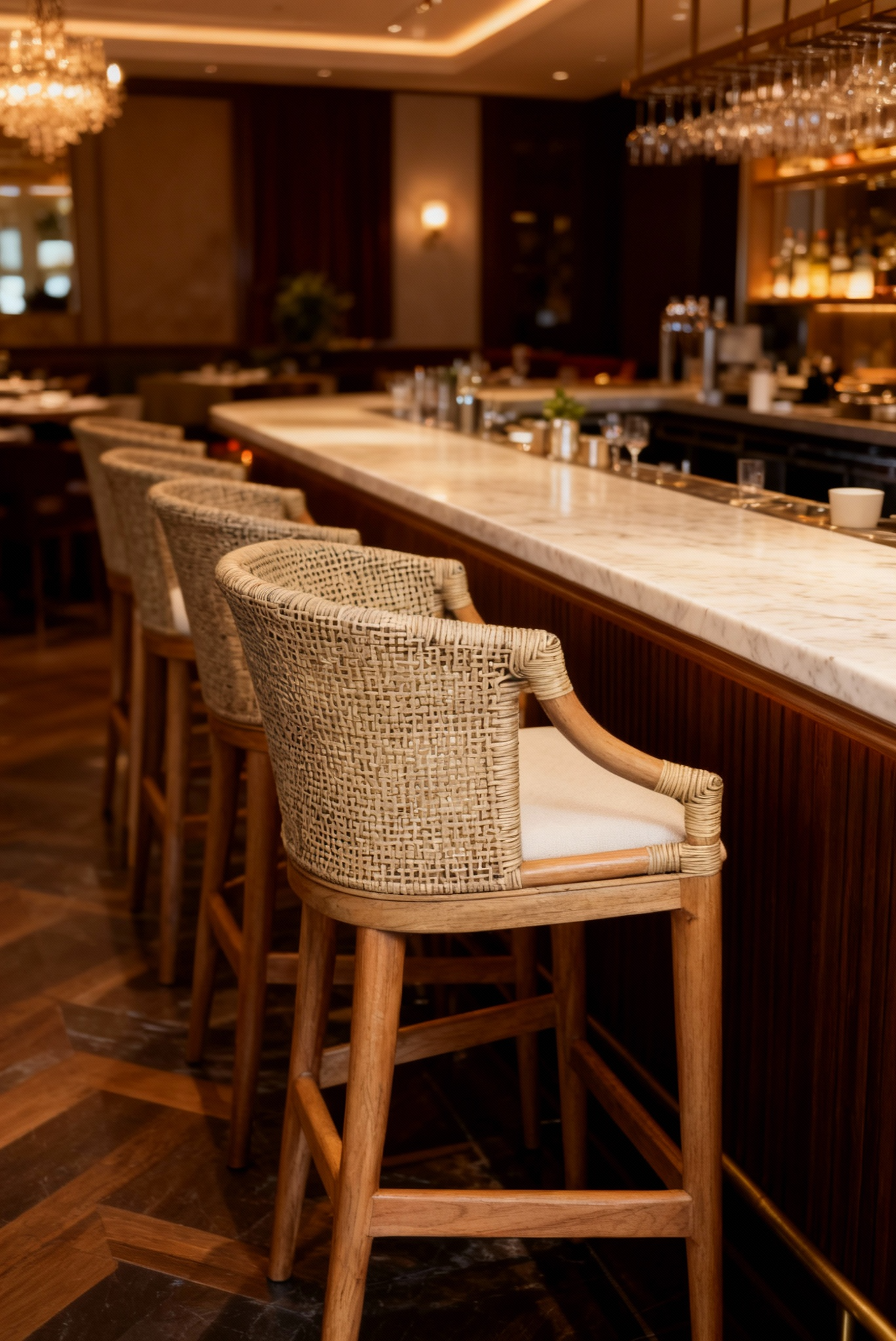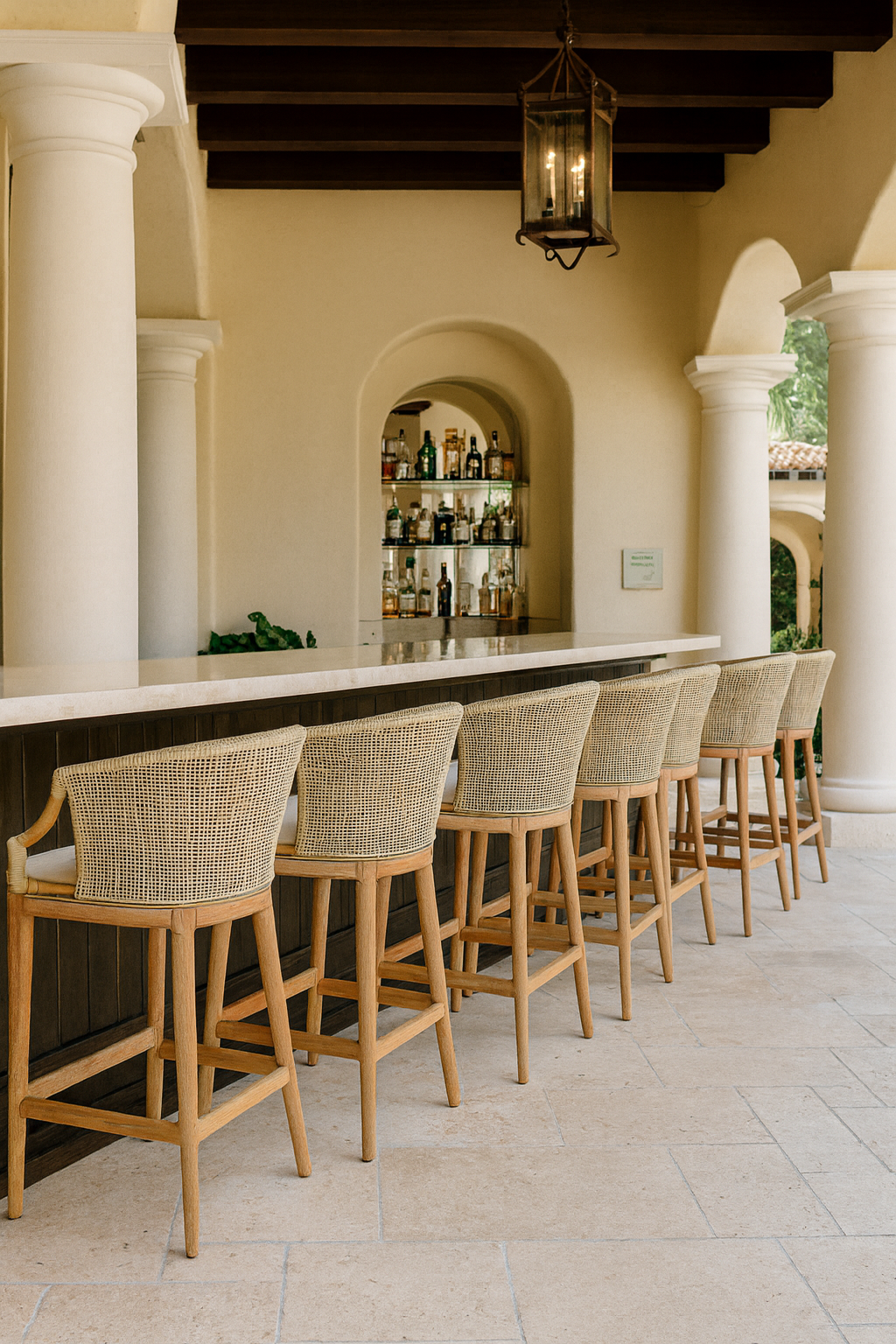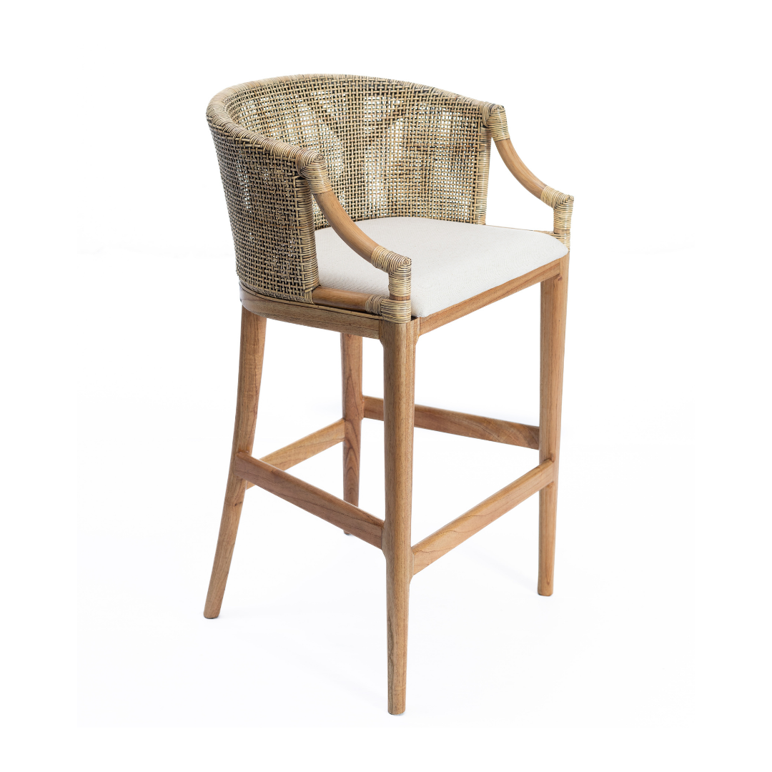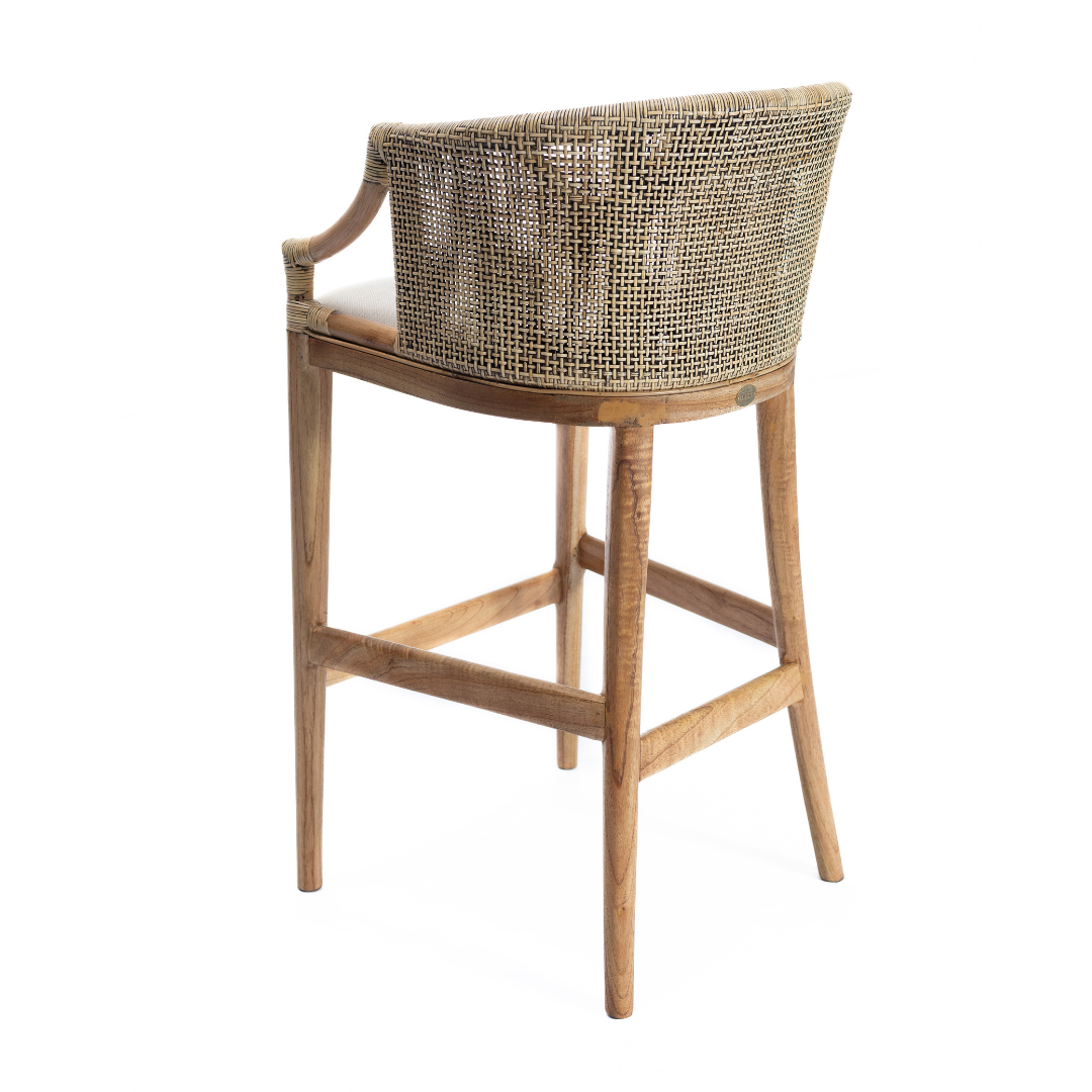 Silla bar Anticado. Estructura en vara de rattan natural y tejido en cáscara de rattan natural.