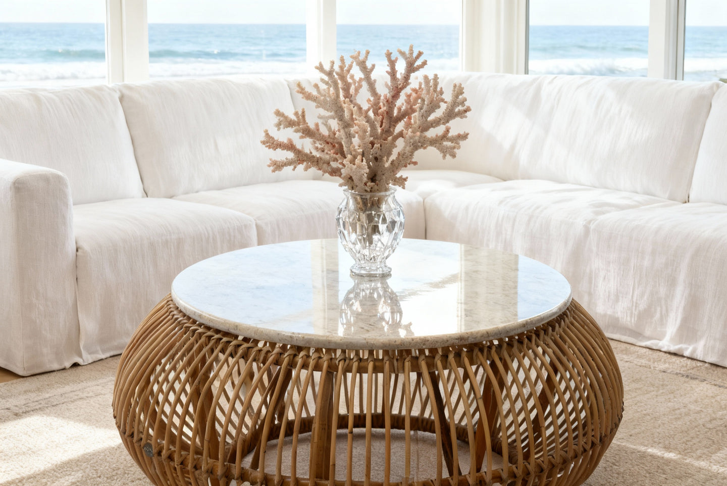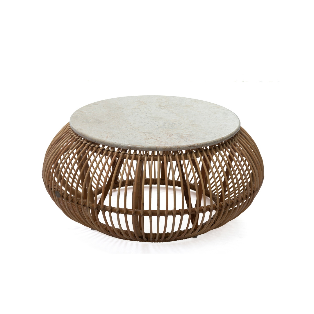 Mesa de centro diámetro 89 x 42 Pavel. Elaborada en vara de rattan con superficie en mármol
