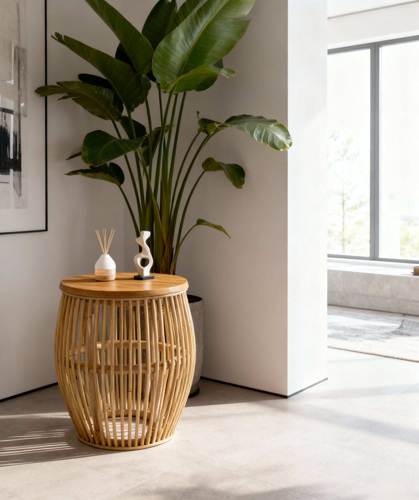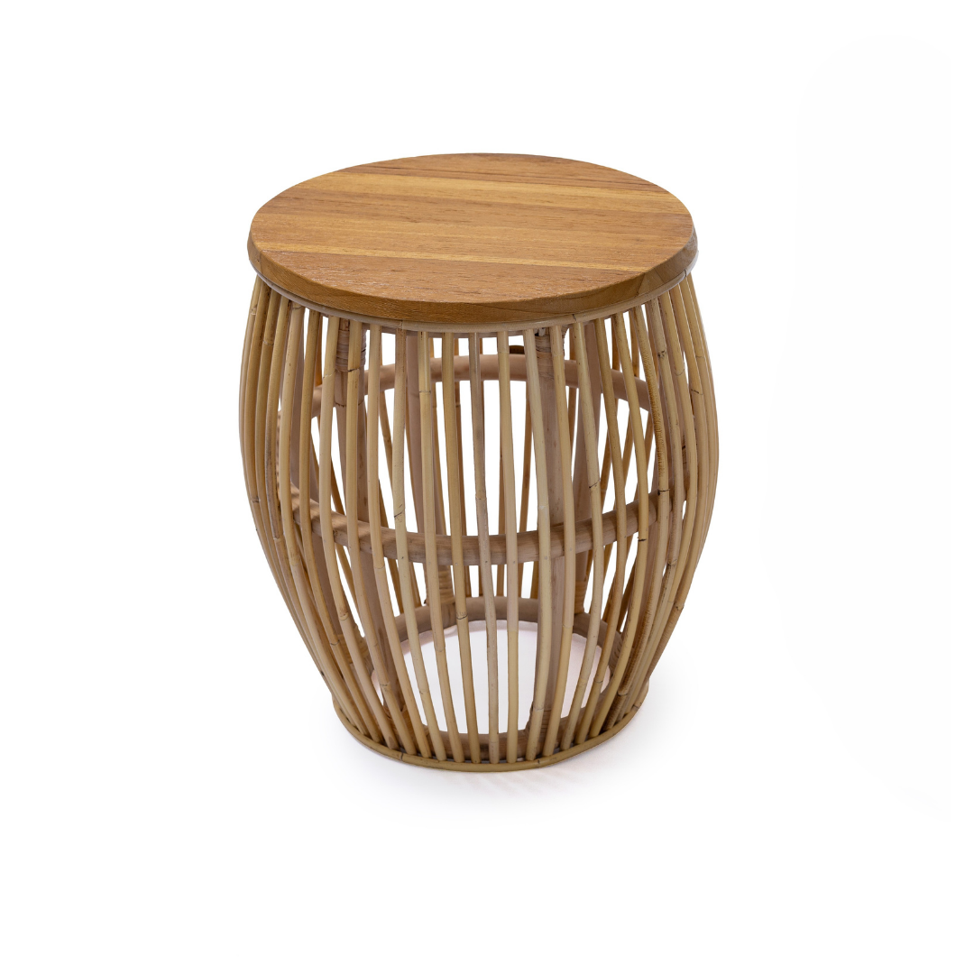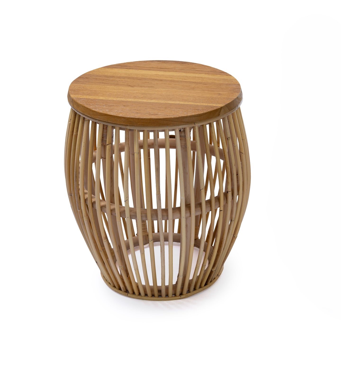 Mesa diam 40 x 45 Pavel. Elaborada en vara de rattan con superficie en madera sungkai