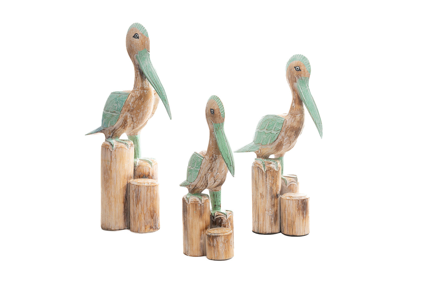 Pelicano aguam/azul l 60cm petros. Pieza elaborada en madera tallada.