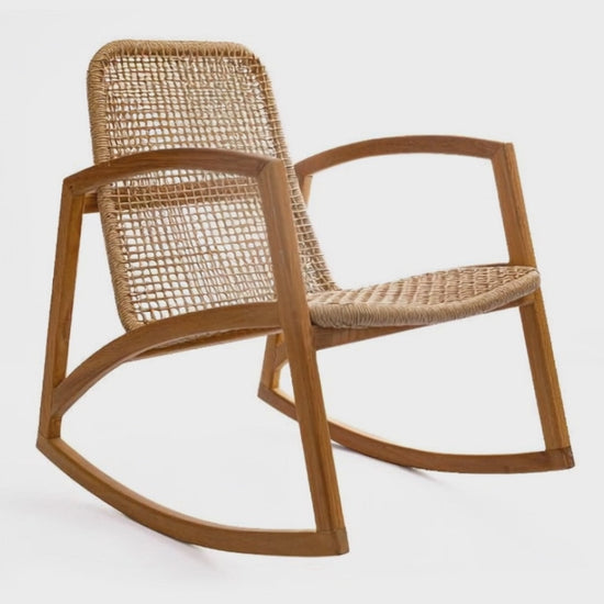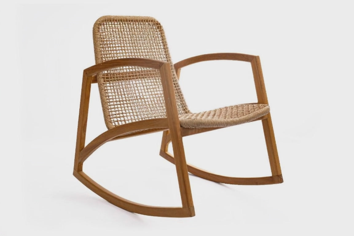 Silla mecedora con brazos intemp rd quantum. Estructura en madera teca, tejido en lazo sintético. .