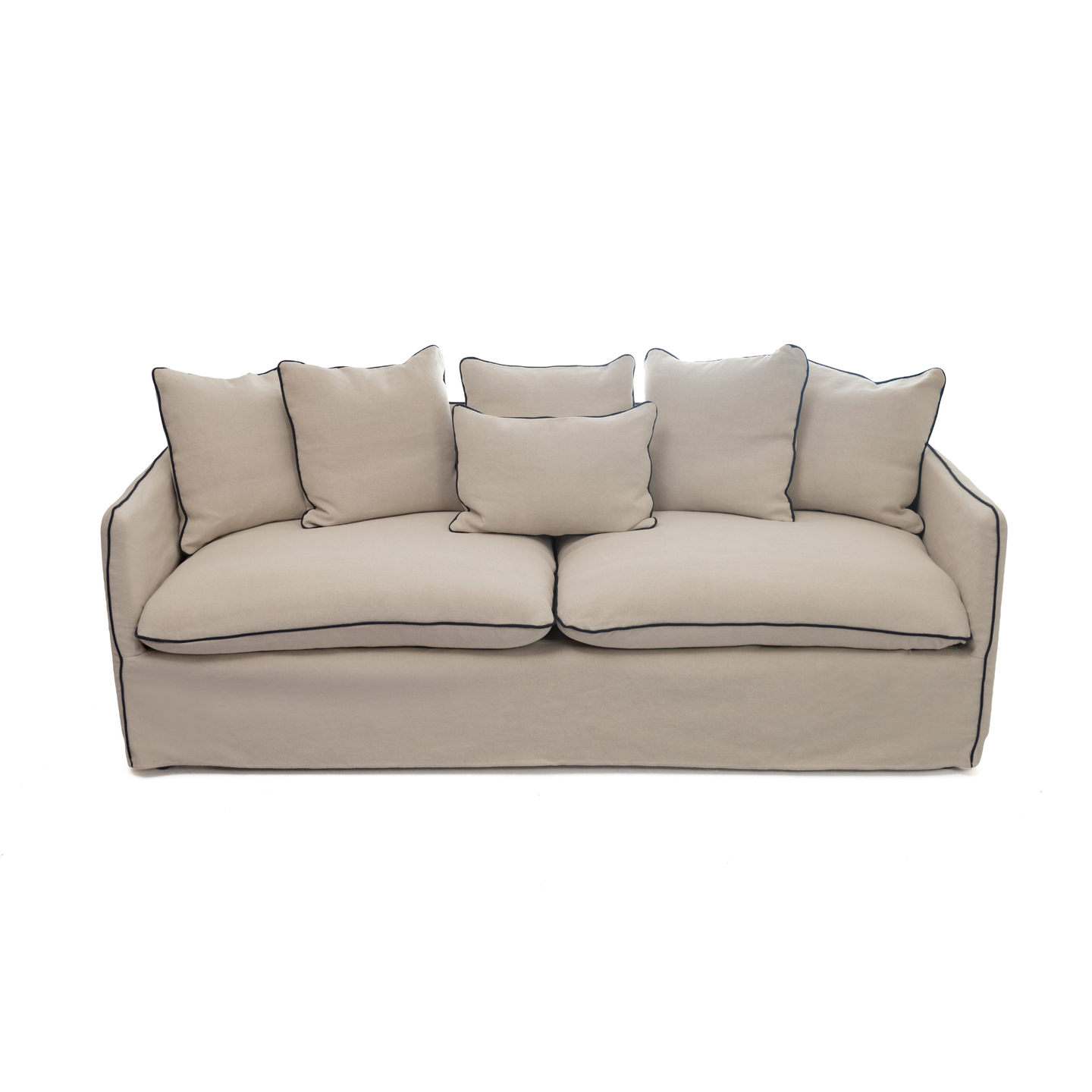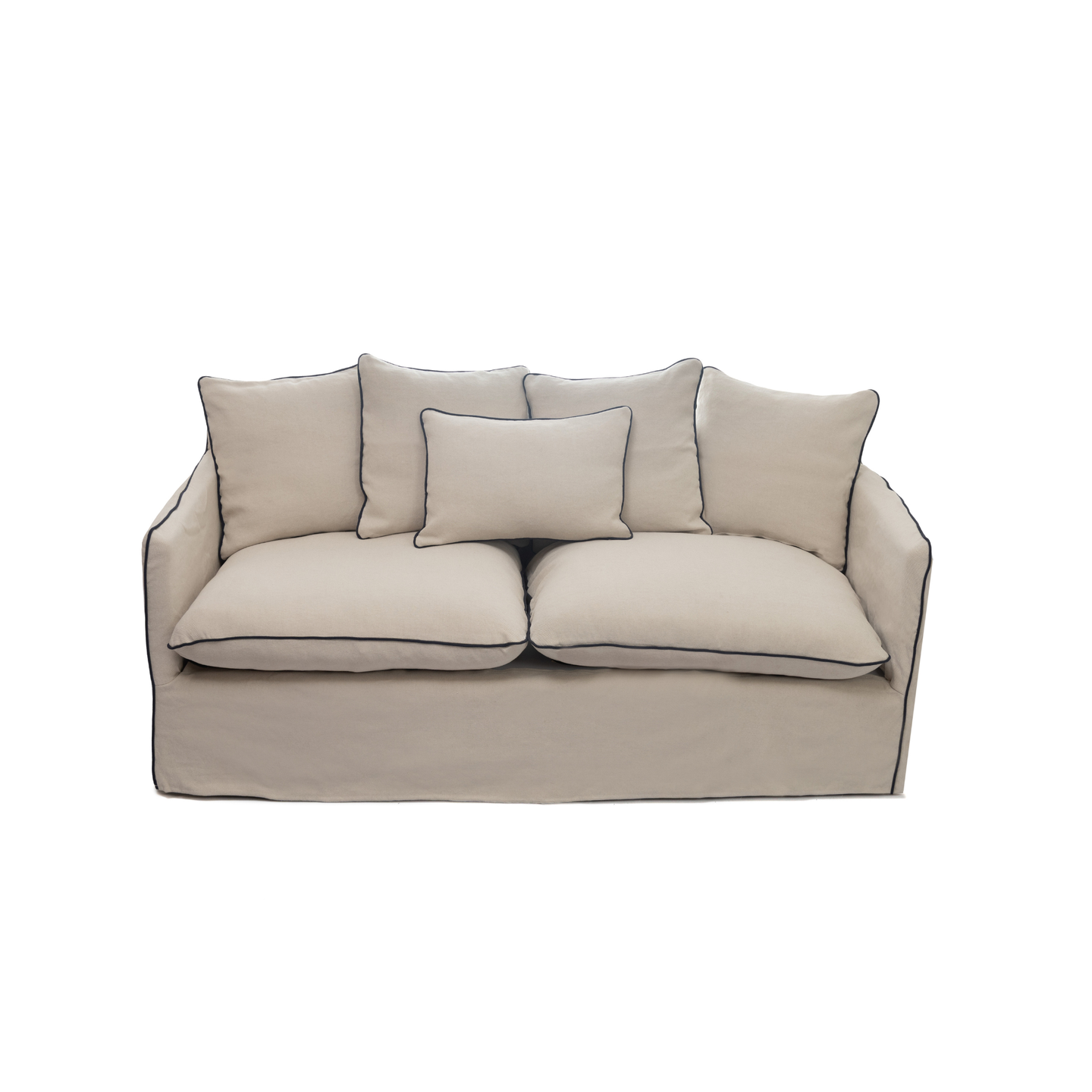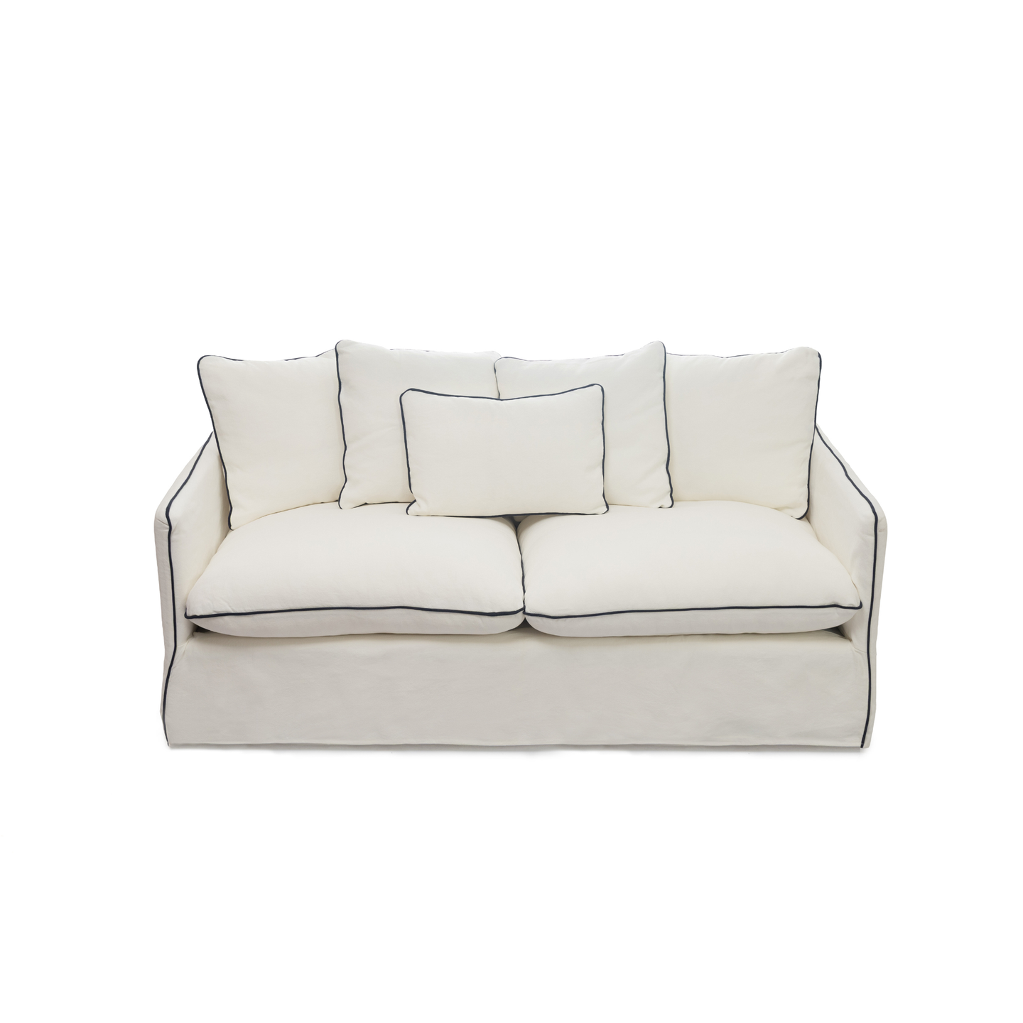 Sofá de 2 puestos con forro blanco completamente desfundable. Tapizado en tela 55% algodón 45% lino. Cojinería elaborada con relleno en plumas. Incluye forro adicional en color beige. Los forros deben ser lavados en seco.