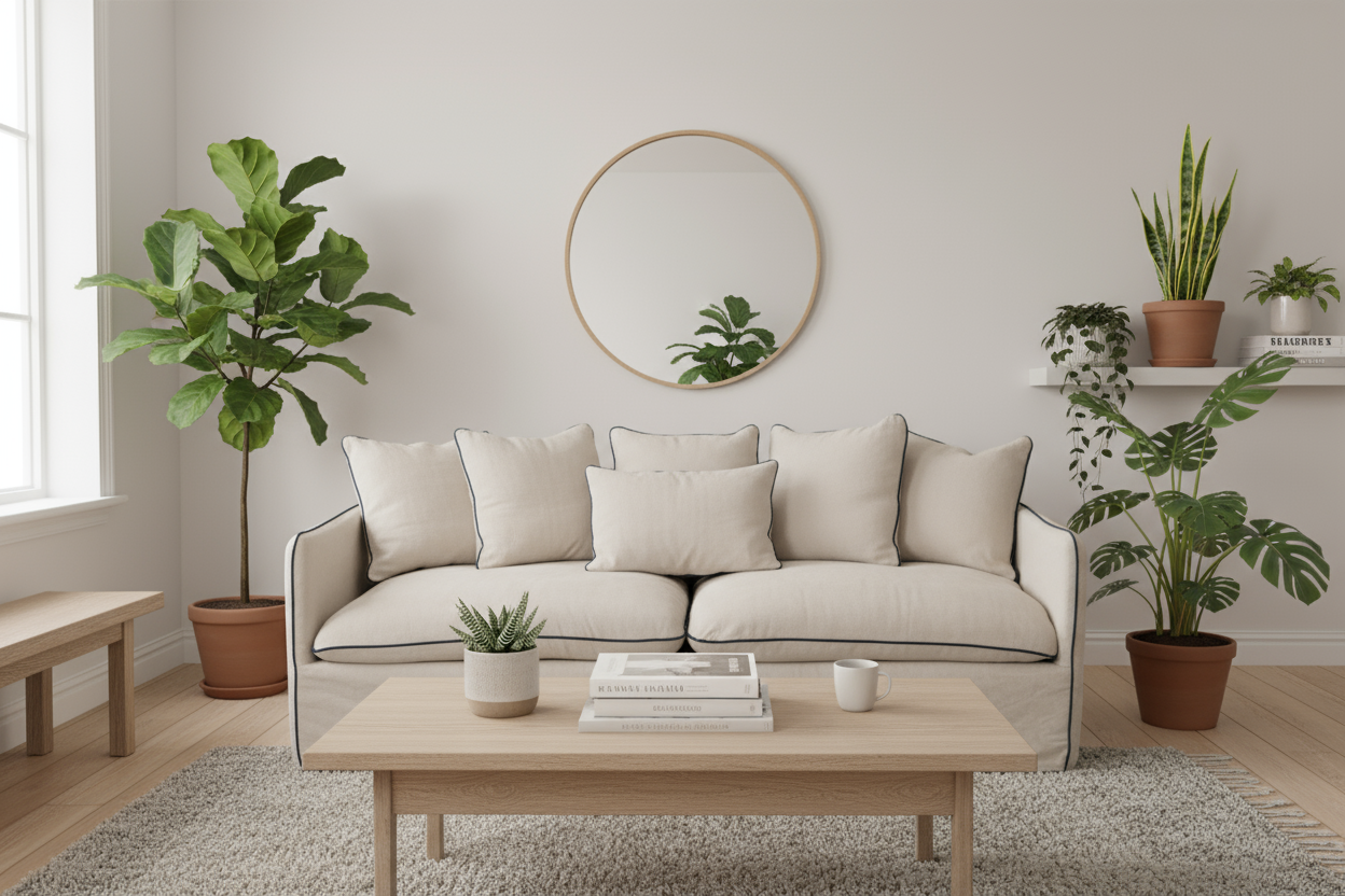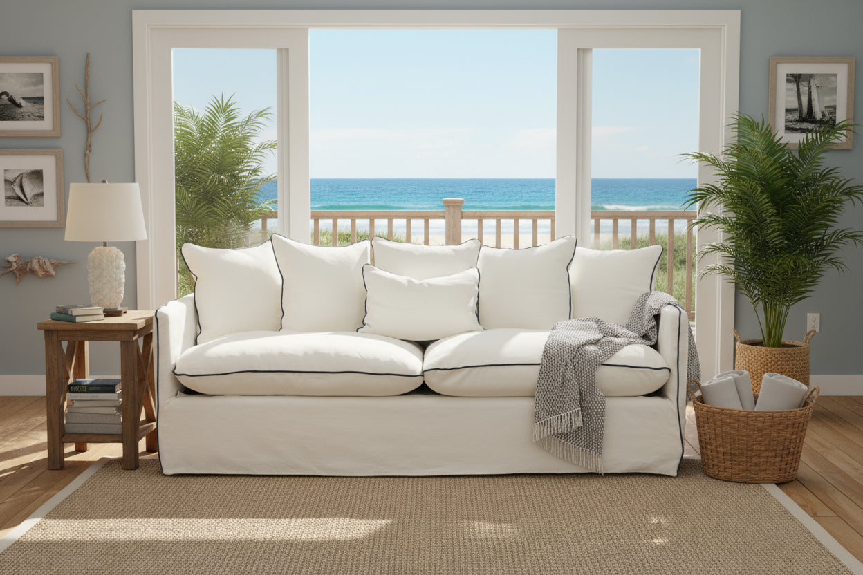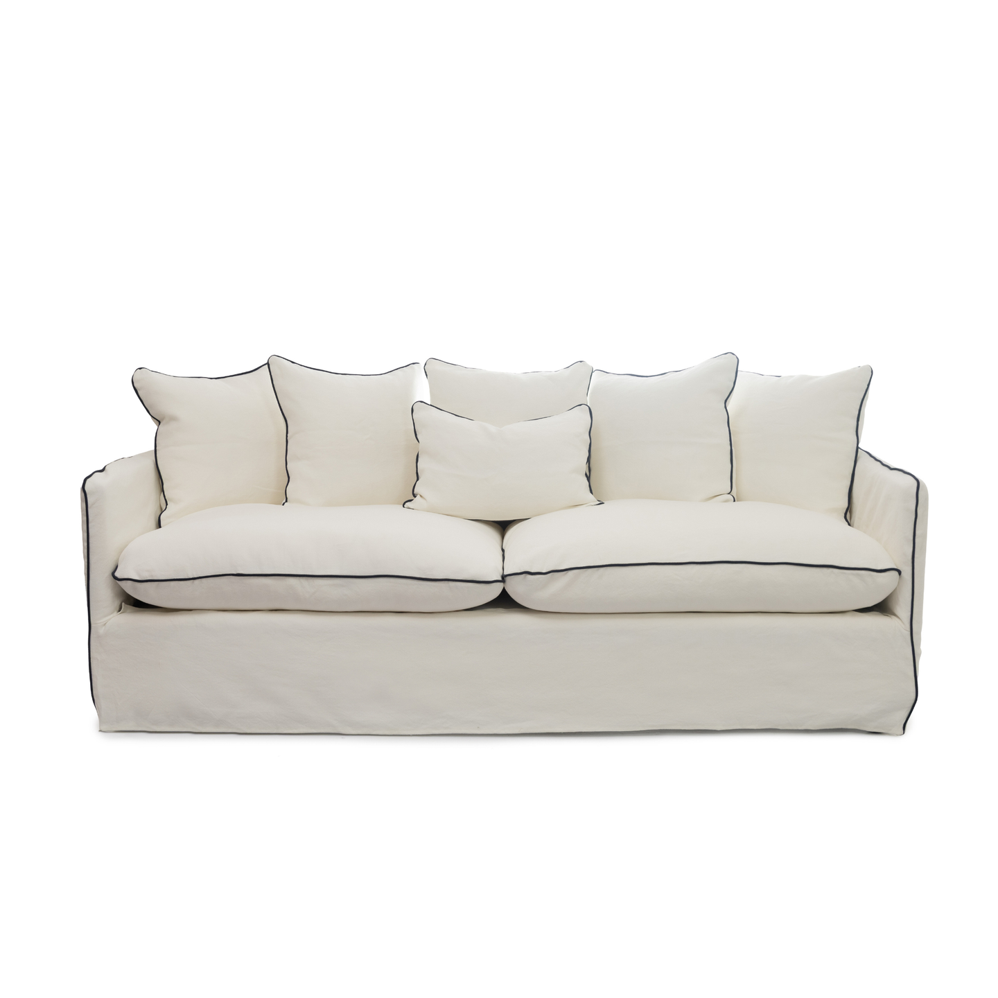 Sofá de 2 puestos con forro blanco completamente desfundable. Tapizado en tela 55% algodón 45% lino. Cojinería elaborada con relleno en plumas. Incluye forro adicional en color beige. Los forros deben ser lavados en seco.