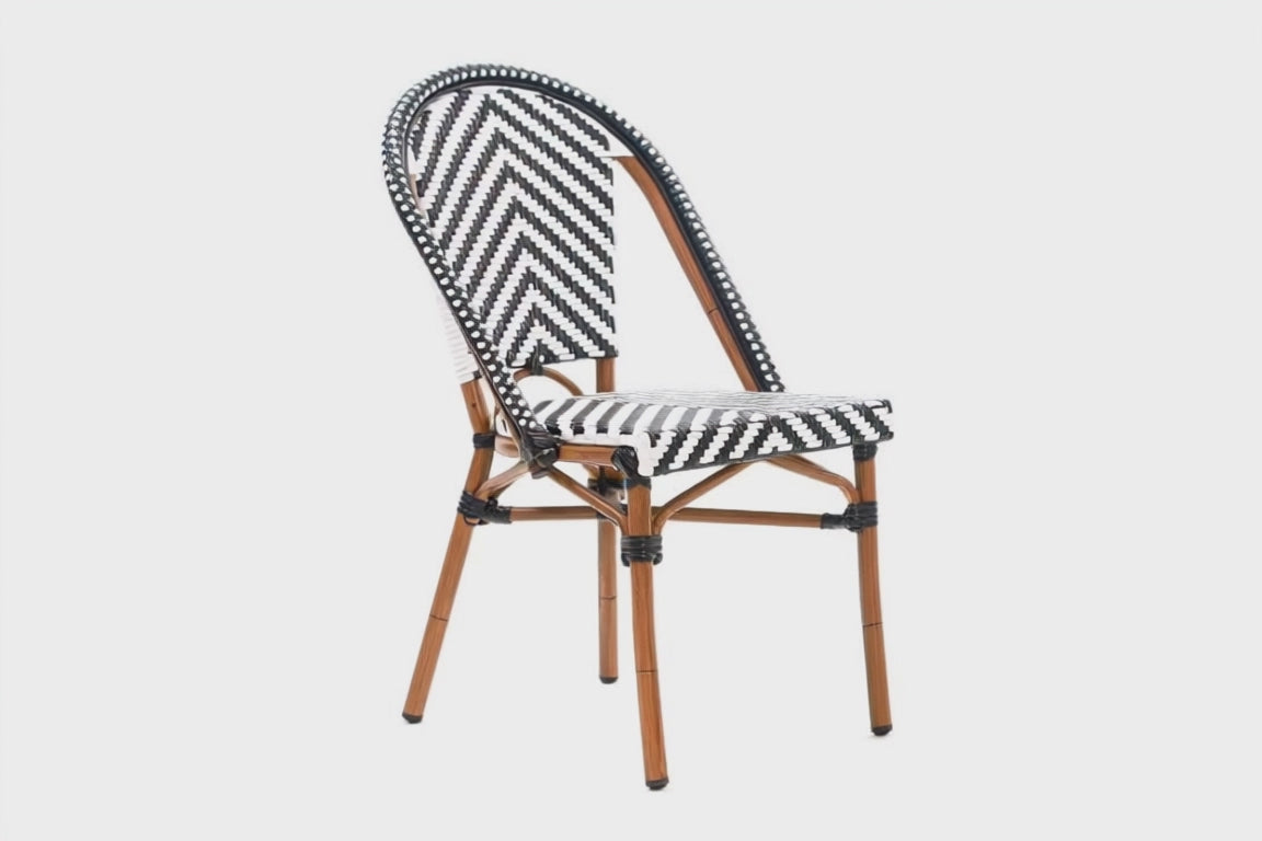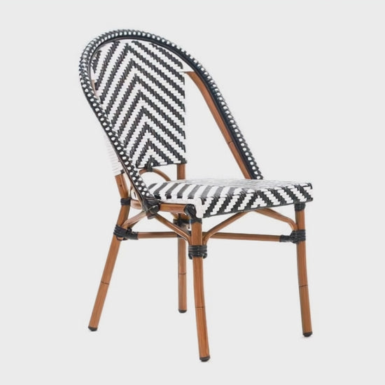 Silla comedor sin brazos ristretto. Estructura en aluminio, sentadero y espaldar en rattan sintético. Apilables de a 10 unidades.