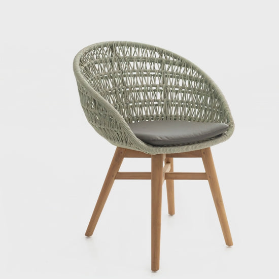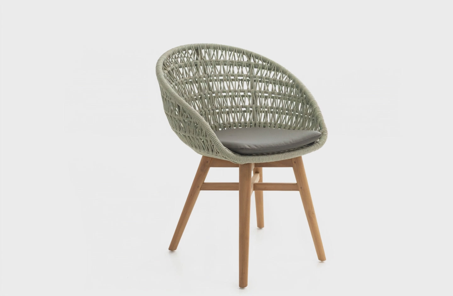 Silla comedor con brazos clry gr-dg intemp rori. Estructura en aluminio, tejido en lazo sintético. Patas en madera teca. Cojínería elaborada en tela para uso exterior.